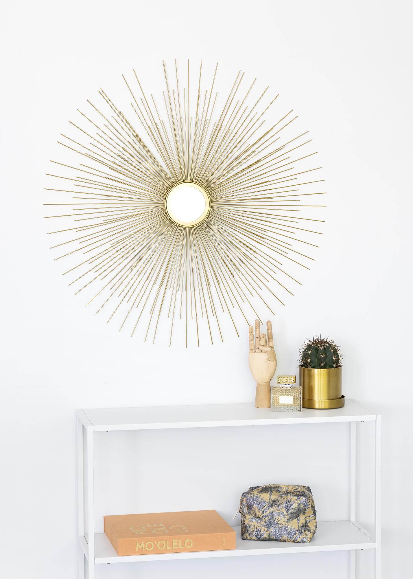 Voici un miroir mural rond qui rappelle un soleil. La plus petite surface du miroir au milieu est élégamment encadrée par de fines tiges métalliques semblables aux rayons du soleil et ce dans une jolie teinte dorée. La surface du miroir est de diamètre 80 cm. Des supports muraux pour l'accrochage sont disponibles. Positionnez ce miroir quelque part dans votre maison pour créer davantage d'espace et de lumière, par exemple dans la chambre à coucher ou bien dans le salon afin d'apporter à la pièce une atmosphère un peu plus élégante !