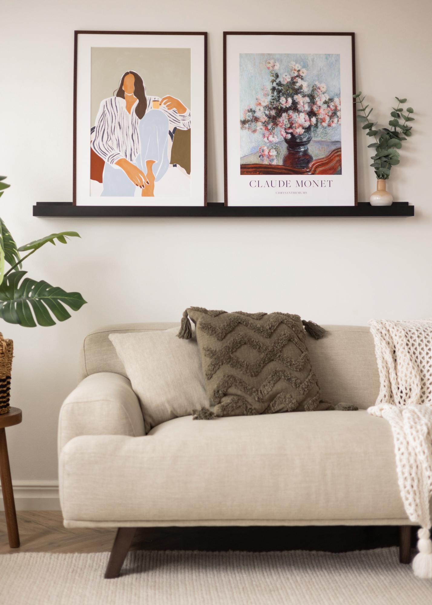 Présentez et variez votre art mural facilement et élégamment avec une étagère à tableaux élégante ! Cette étagère à tableaux est fabriquée en MDF et est peinte en noir tendance avec une belle finition semi-brillante. La cimaise a un design épuré avec des lignes droites et simples et une sensation minimaliste. La tablette a une rainure usinée au milieu qui sert de support à vos tableaux et leur donne un bel angle lorsqu'ils sont inclinés contre le mur.