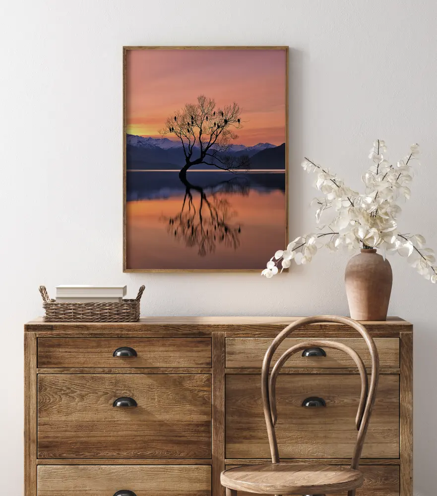 Une belle affiche nature représentant un arbre solitaire au milieu d'un lac. Avec les oiseaux paisiblement perchés sur les branches, cette impression pastel reflète l'arbre dans le lac, créant un parfait effet miroir de la nature et des couleurs. Vous percevez le silence dans ce poster apaisant ?
