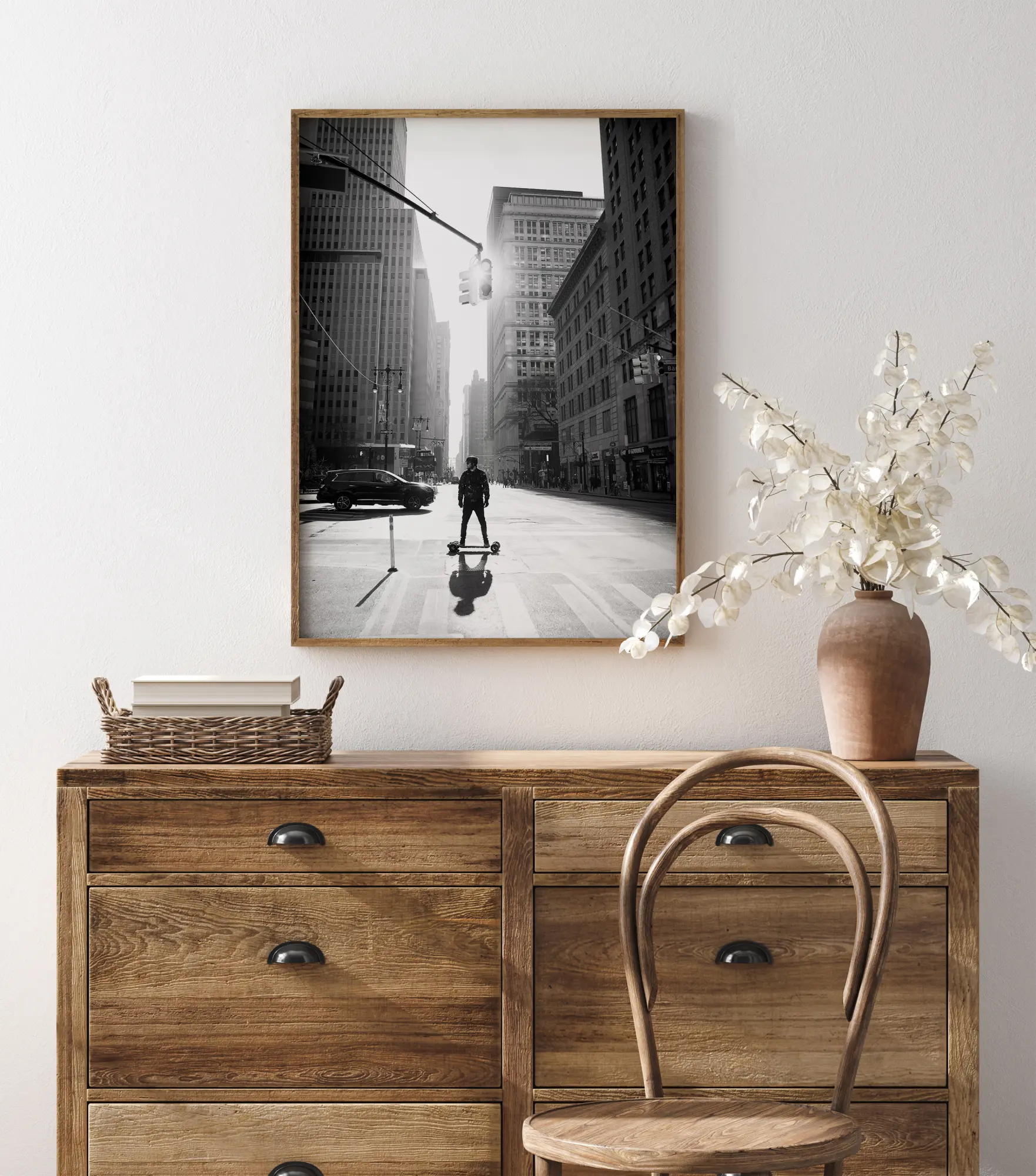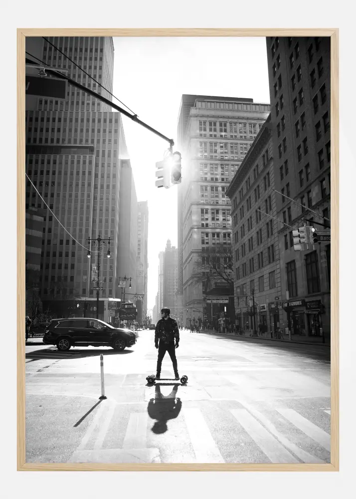 Une affiche de paysage urbain représentant un homme sur un skateboard au milieu d'une rue de New York. Le faisceau lumineux central lui donne un air futuriste. Ajoutez une touche de modernité à votre intérieur.