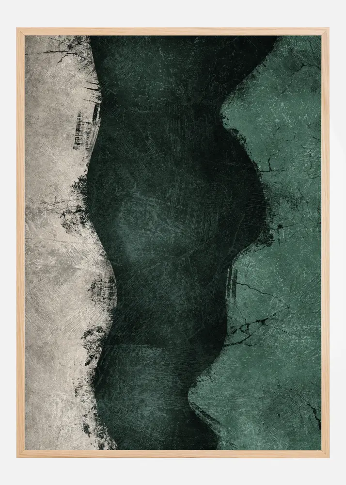 Cette affiche offre un fort impact visuel avec sa composition divisée de formes texturées, semblables à une image aérienne d'un paysage sombre ou une crevasse entre deux mondes. Un côté montre une teinte verte intense avec des textures profondes, et l'autre une nuance plus pâle contrastante qui ensemble donne une sensation de contraste dynamique de la nature entre forêt et paysage ouvert. C'est une image dramatique et captivante qui joue avec les ombres et la lumière, créant un sentiment à la fois de mystère et de fascination.