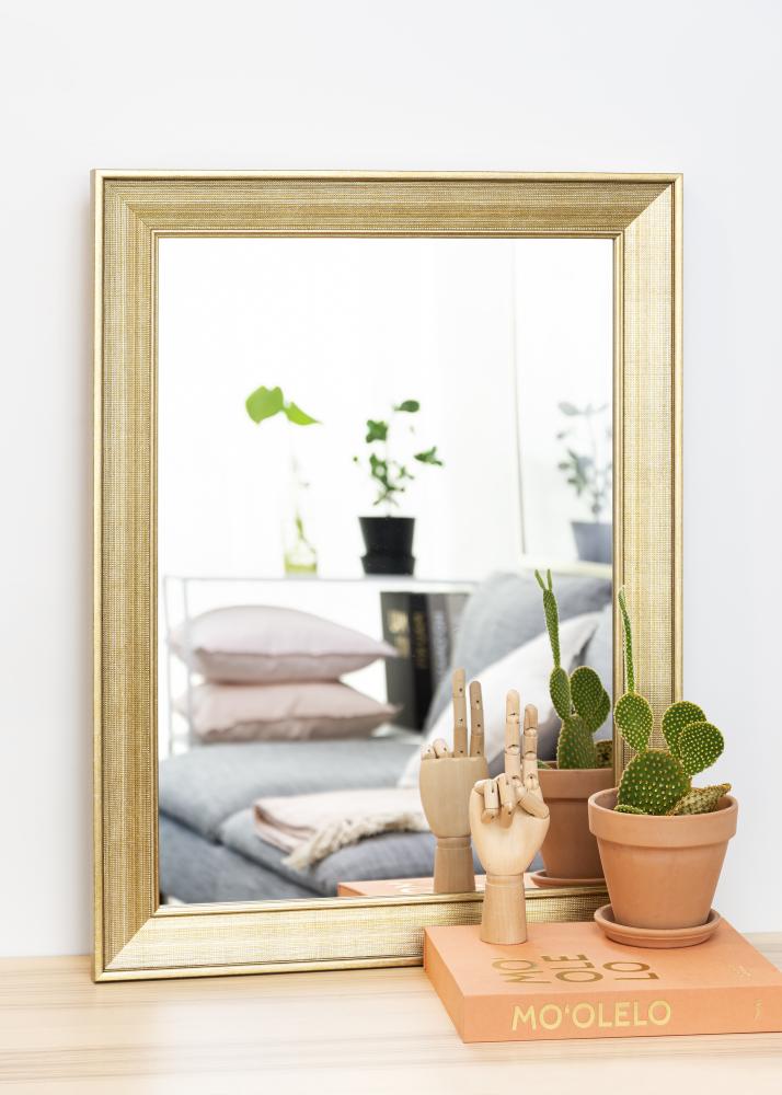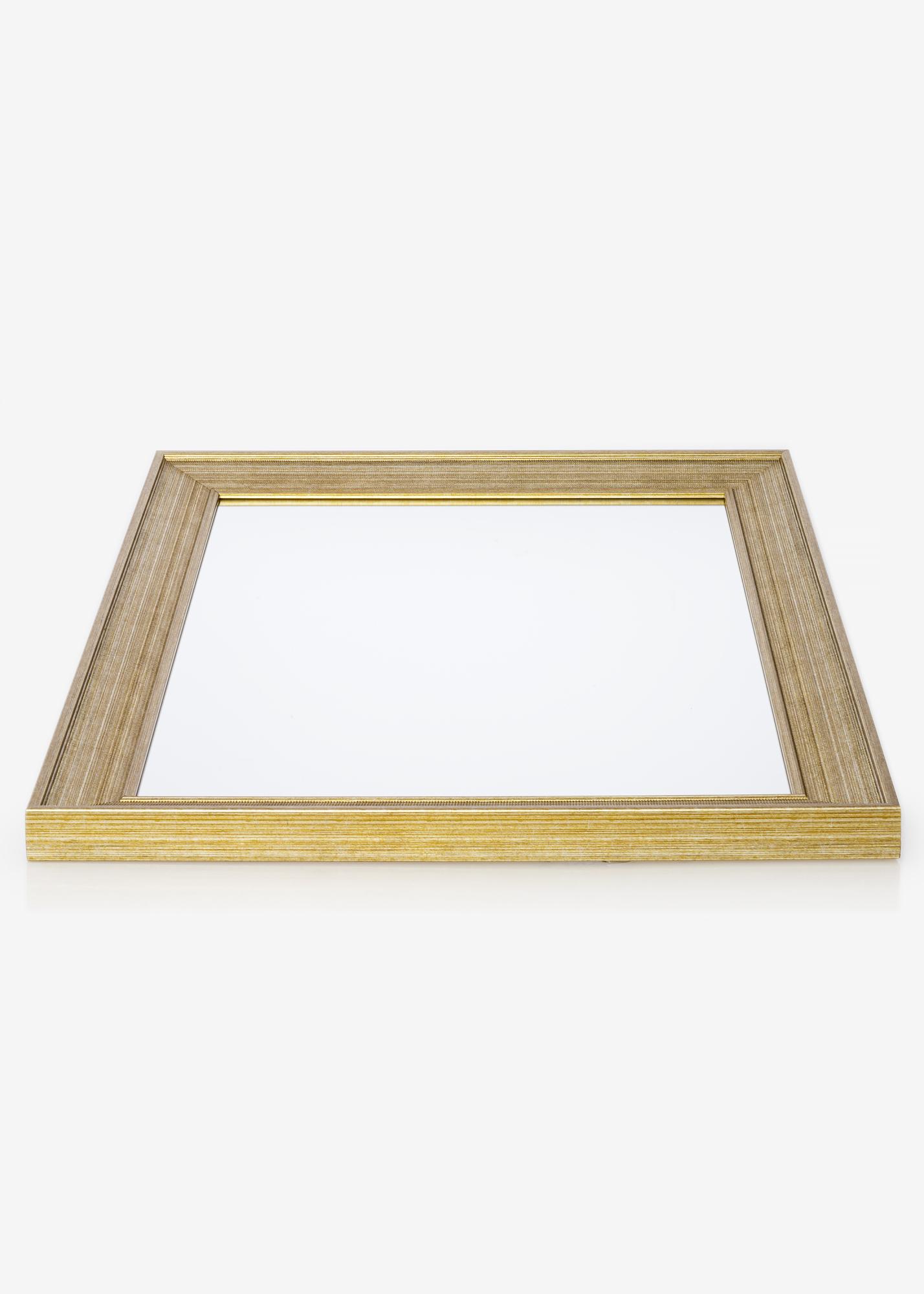 Embellissez votre mur avec un superbe miroir doré que vous compléterez avec d'autres objets de la même teinte. Ce modèle est doté d'un cadre au profilage classique le long du verre et à l'extrémité des bordures, tandis que la partie centrale large est de texture rappelant des petites chaînes en or.