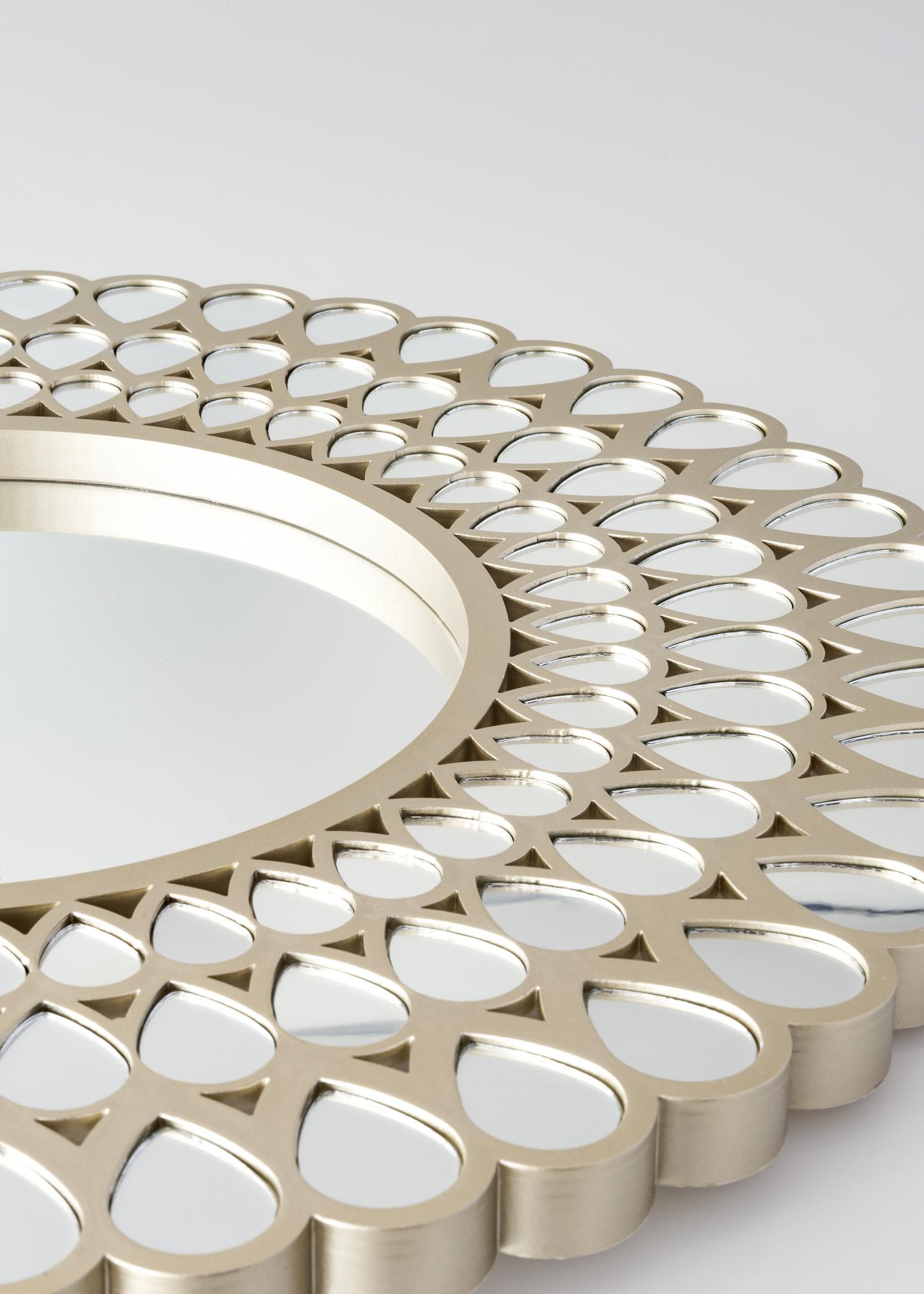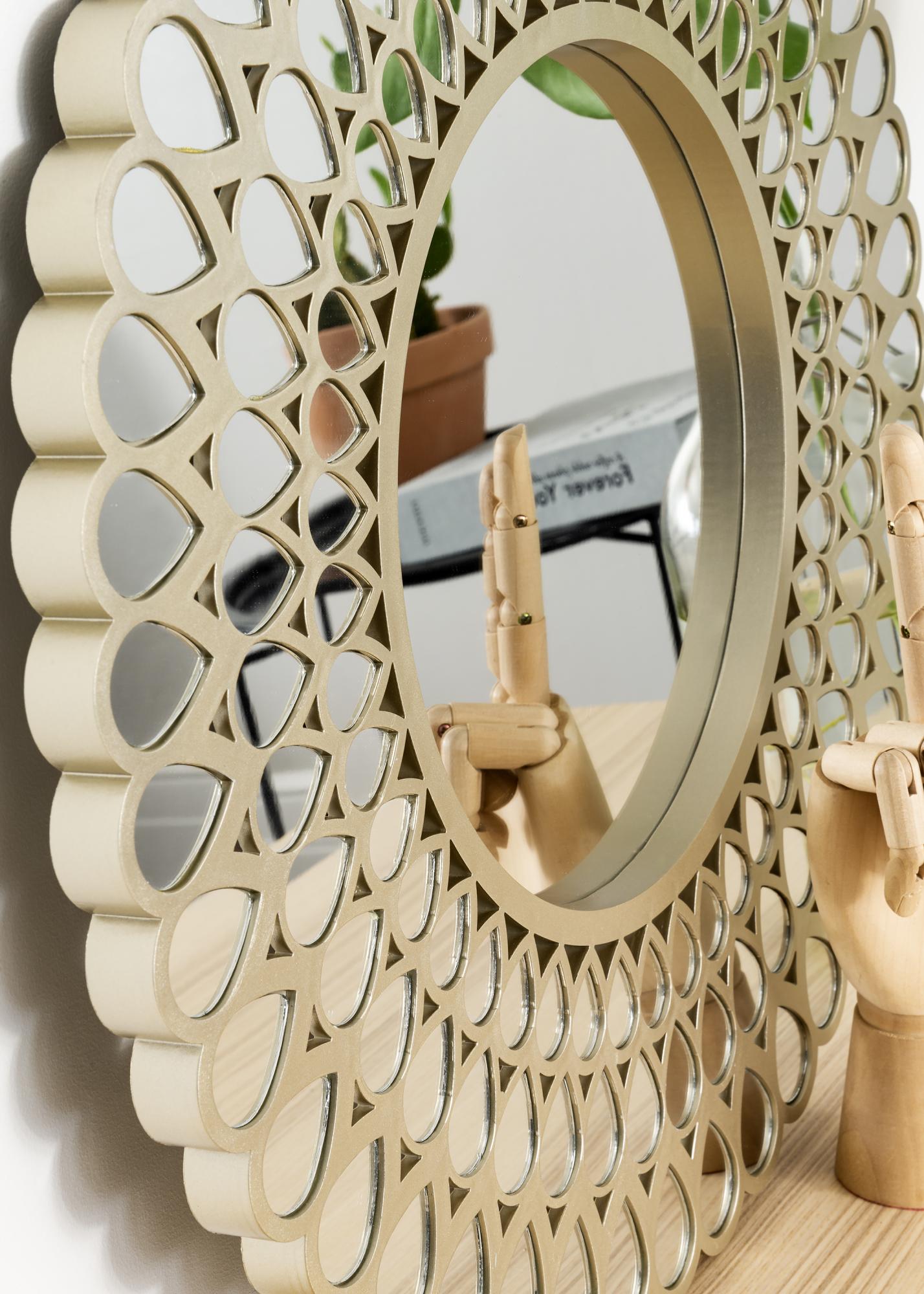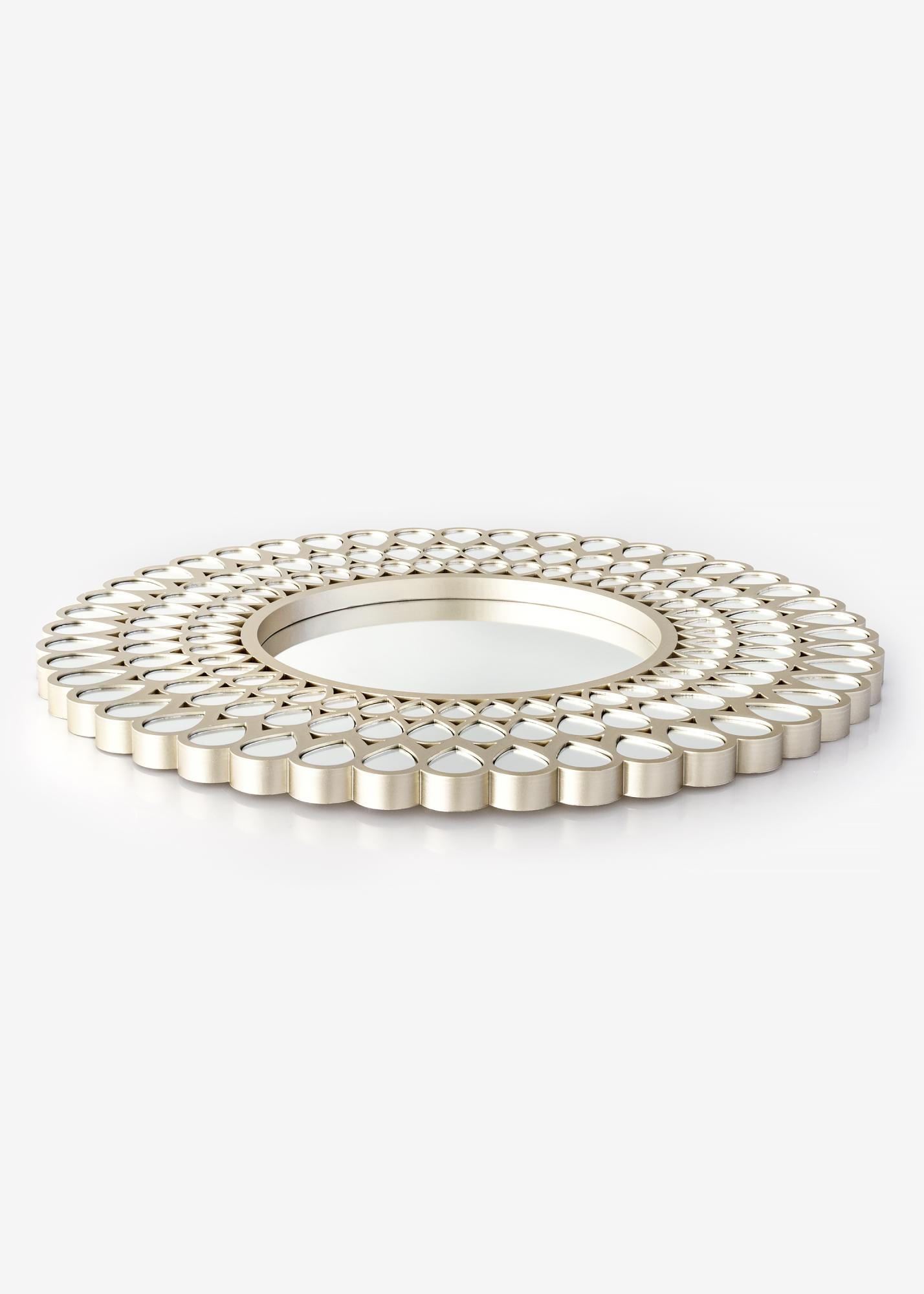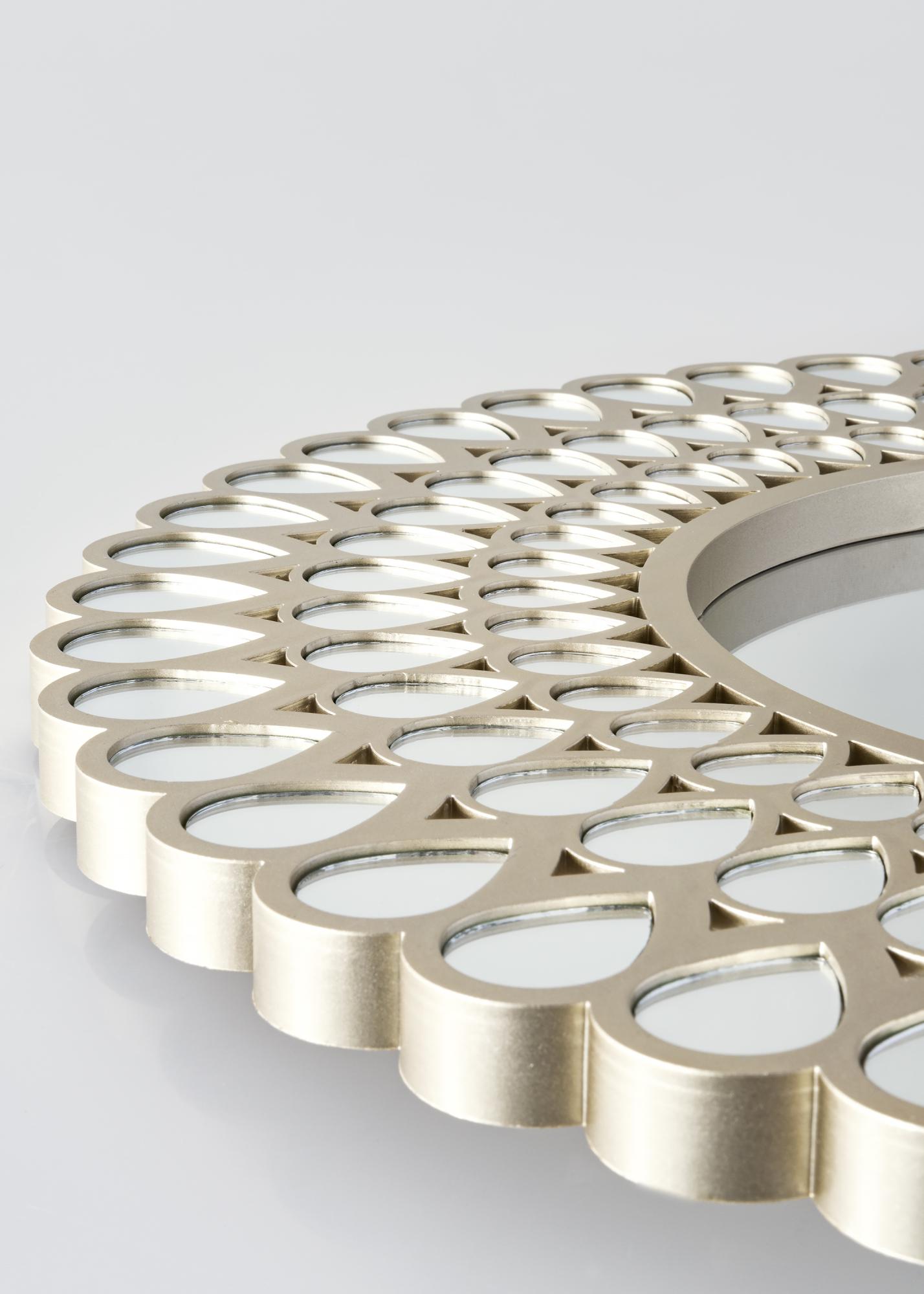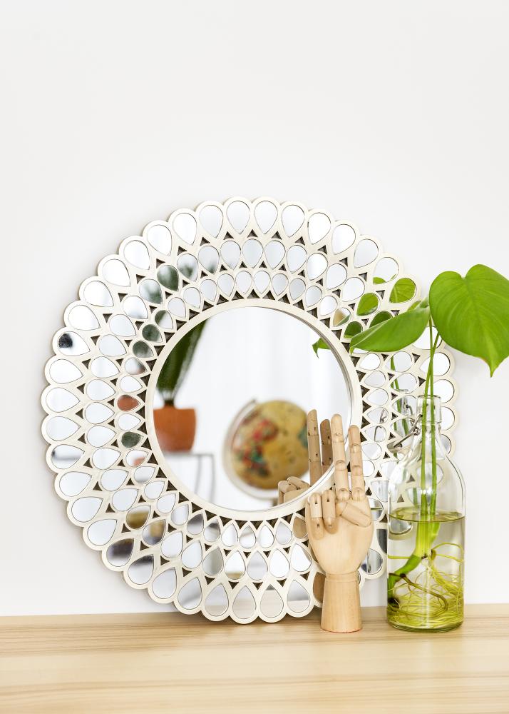 Bea est un miroir rond au design très décoratif. Son cadre est de couleur argentée et est orné de petits miroirs en forme de goutte, ce qui donne à l'ensemble un effet élégant.