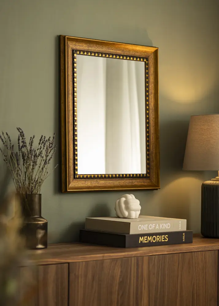 Ce miroir a une couleur brune chaude avec une finition antique élégante qui donne à la pièce un charme intemporel. Le profil large a une lueur subtile et est décoré avec un détail distinctif rayé en or et noir le long du bord intérieur. Cela crée un beau contraste et attire le regard vers le centre du miroir.