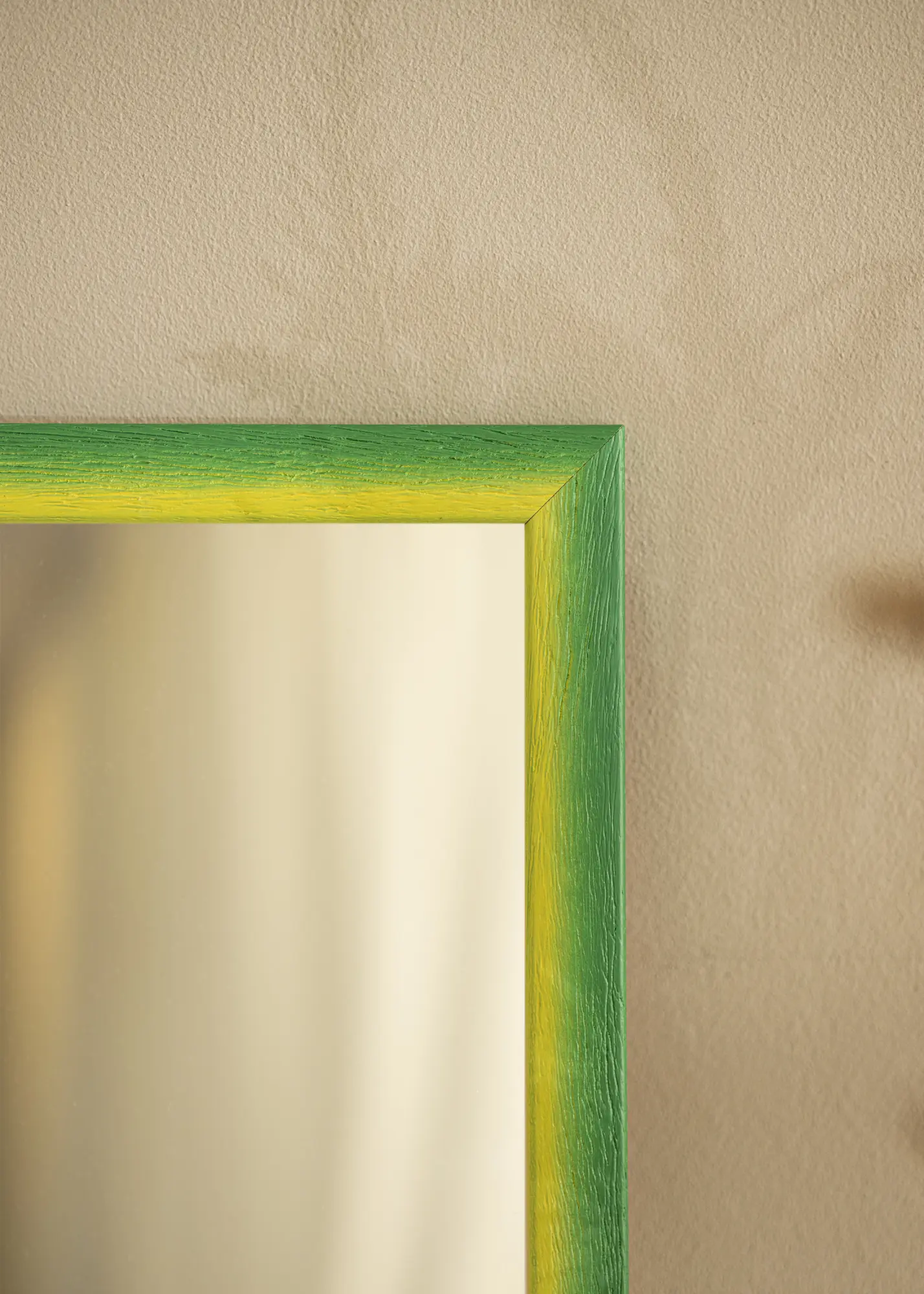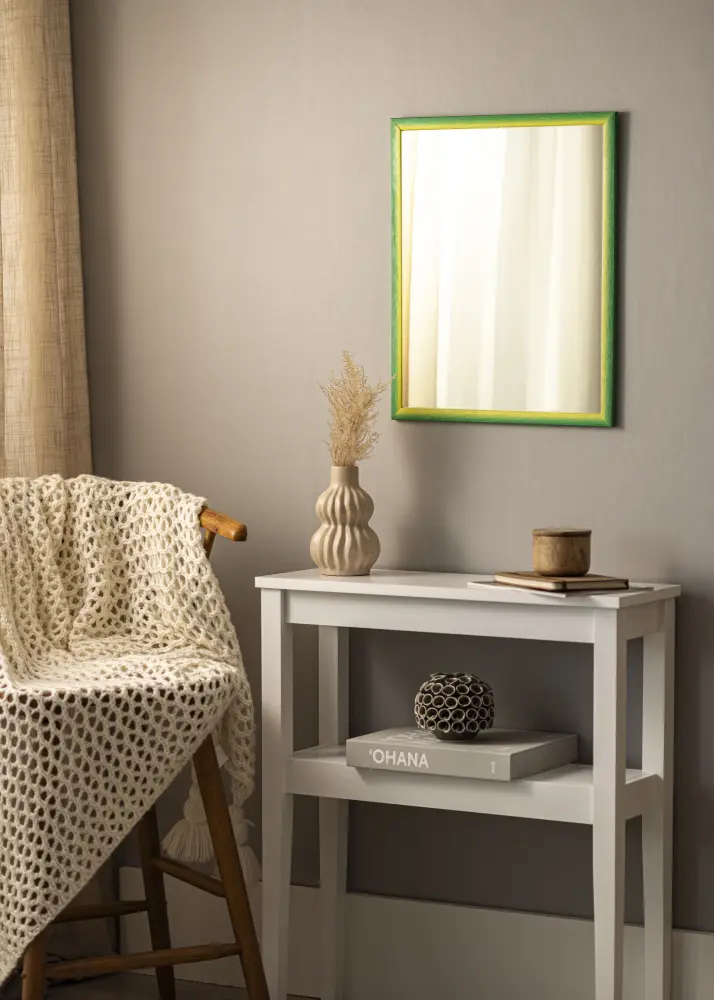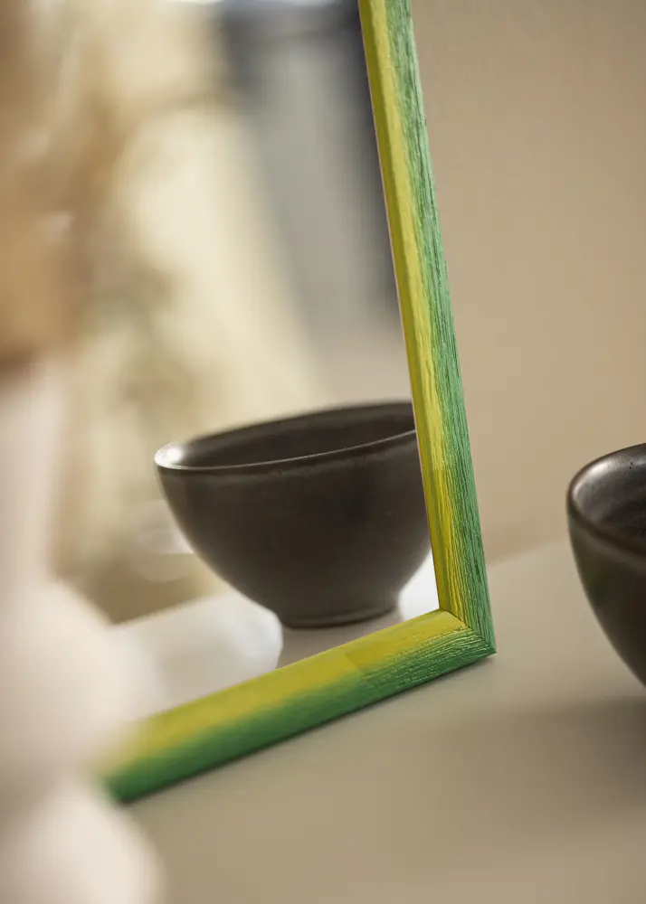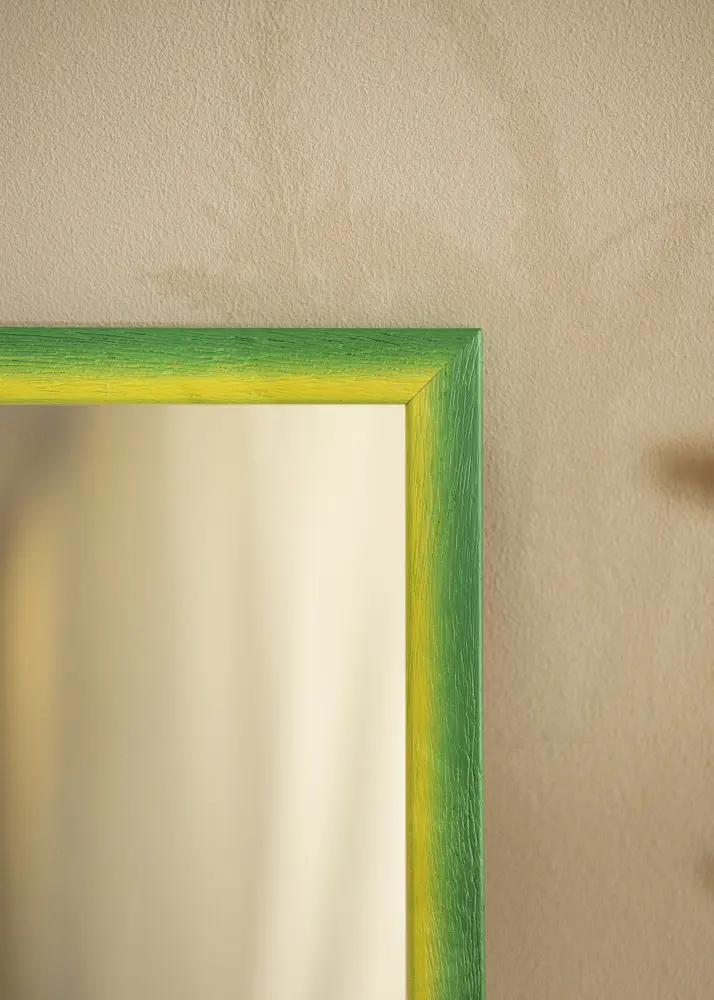 Ce miroir se distingue par sa palette de couleurs vibrante, où une douce transition du jaune solaire au vert luxuriant crée une atmosphère harmonieuse et accueillante. La surface est marquée par une structure de bois distincte avec des veines profondes, ce qui donne au miroir une sensation tactile à la fois moderne et rustique. Les tons de couleur se fondent naturellement pour créer un effet peint à la main avec une expression organique, rendant chaque miroir unique en son genre.