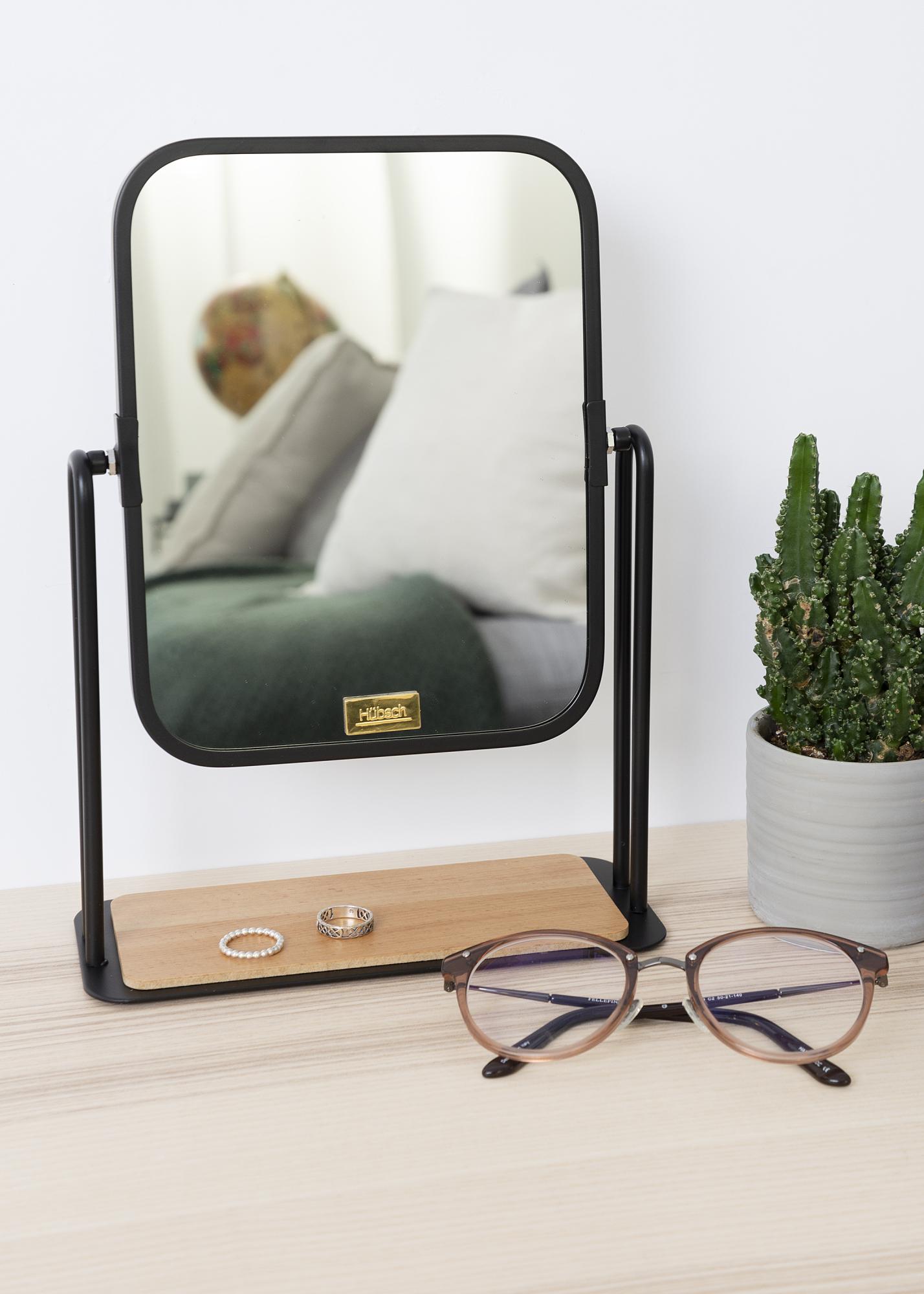 Ce miroir de table est à la fois magnifique et fonctionnel - de plusieurs manières. Le miroir a une forme rectangulaire et est encadré d'un cadre fin et élégant en métal noir. À la base du support se trouve un petit plateau en bois qui est parfait pour ranger vos petites affaires.