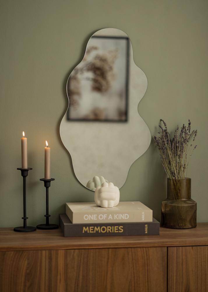 Vous avez beaucoup de lignes droites chez vous ? Alors il sera de bon goût de créer une rupture avec un miroir dans une douce forme ondulée ! Fierce Cloud est un miroir mural tendance sans cadre, conçu avec des bords ondulés. Le verre réfléchissant fin de 4 mm rend ce miroir élégant et joli, lui donnant une apparence convenant aussi bien aux chambres qu'aux salons. Il mesure 40x70 cm.