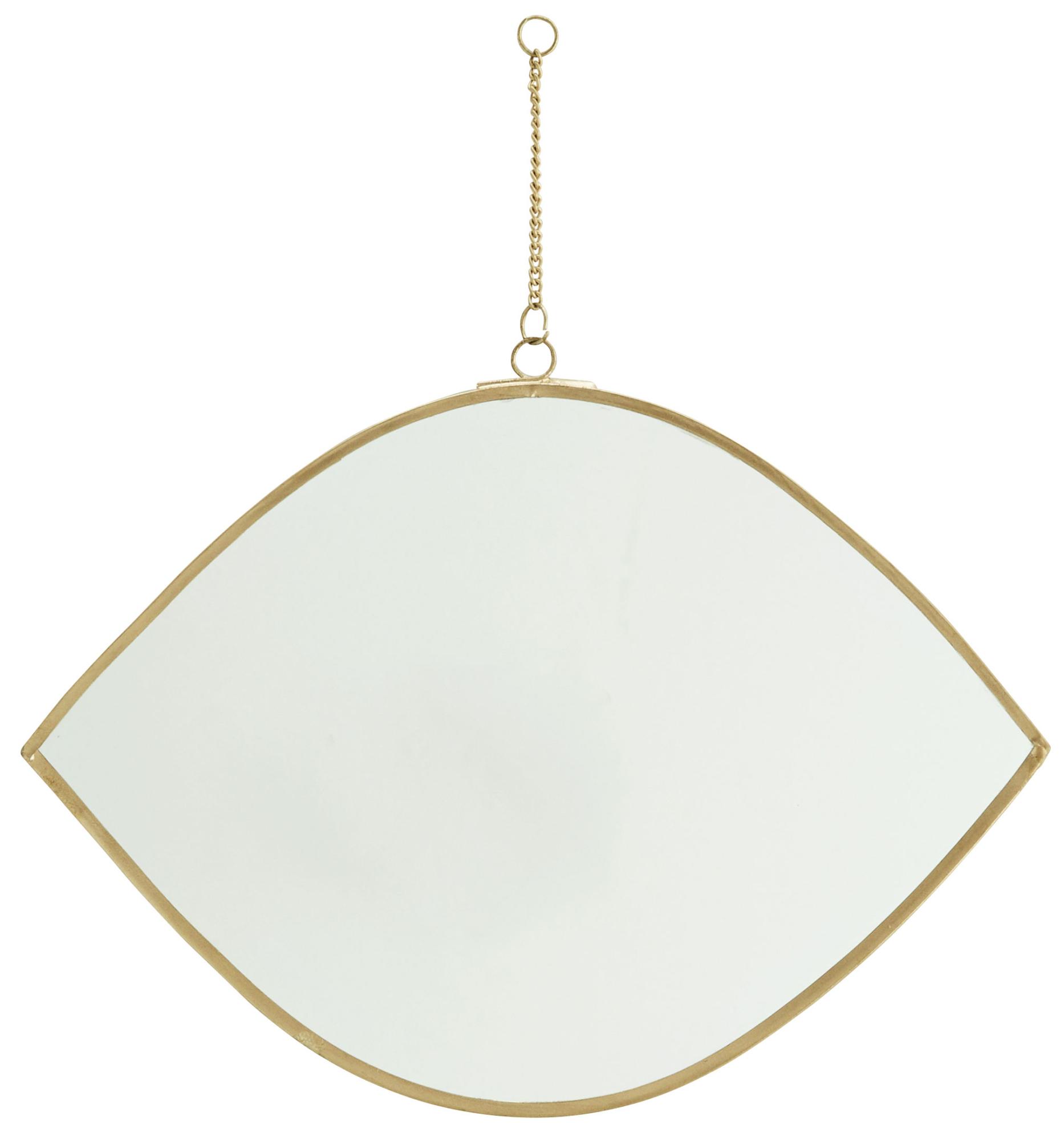 Permettez à ce beau miroir de Madam Stoltz de devenir un détail de décoration accrocheur dans votre intérieur. La forme spéciale imite un œil, ce qui, associé au cadre couleur laiton, rend ce miroir mural très élégant. Le miroir est suspendu avec une chaîne délicate, ce qui renforce encore la sensation d'élégance. Ce modèle de miroir est disponible en deux tailles différentes, dont celle-ci a une longueur de 26 cm. La taille délicate du miroir mural le rend très intéressant à assortir avec d'autres modèles de miroirs.