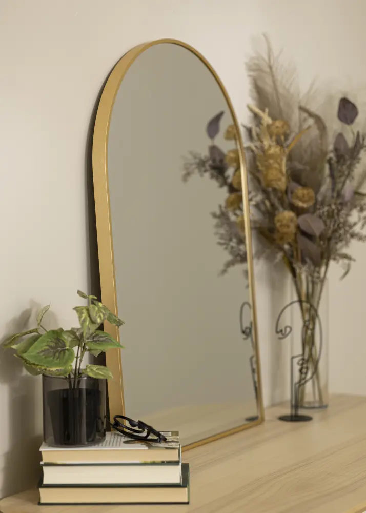 Voici un miroir mural moderne qui peut s'utiliser dans toutes les pièces de la maison. Vous pouvez en faire un détail d'intérieur tendance dans la chambre à coucher ou bien dans le salon, ou pourquoi pas l'utiliser comme miroir de salle de bain ou bien comme miroir dans le hall d'entrée afin de vous jeter un dernier coup d'œil avant de partir pour la journée. Le miroir se pare d'un encadrement en métal d'une profondeur de 28 mm, il se présente dans une teinte dorée exclusive pour plus de finesse. Son design stylisé sous forme d'arche renforce son aspect luxueux.