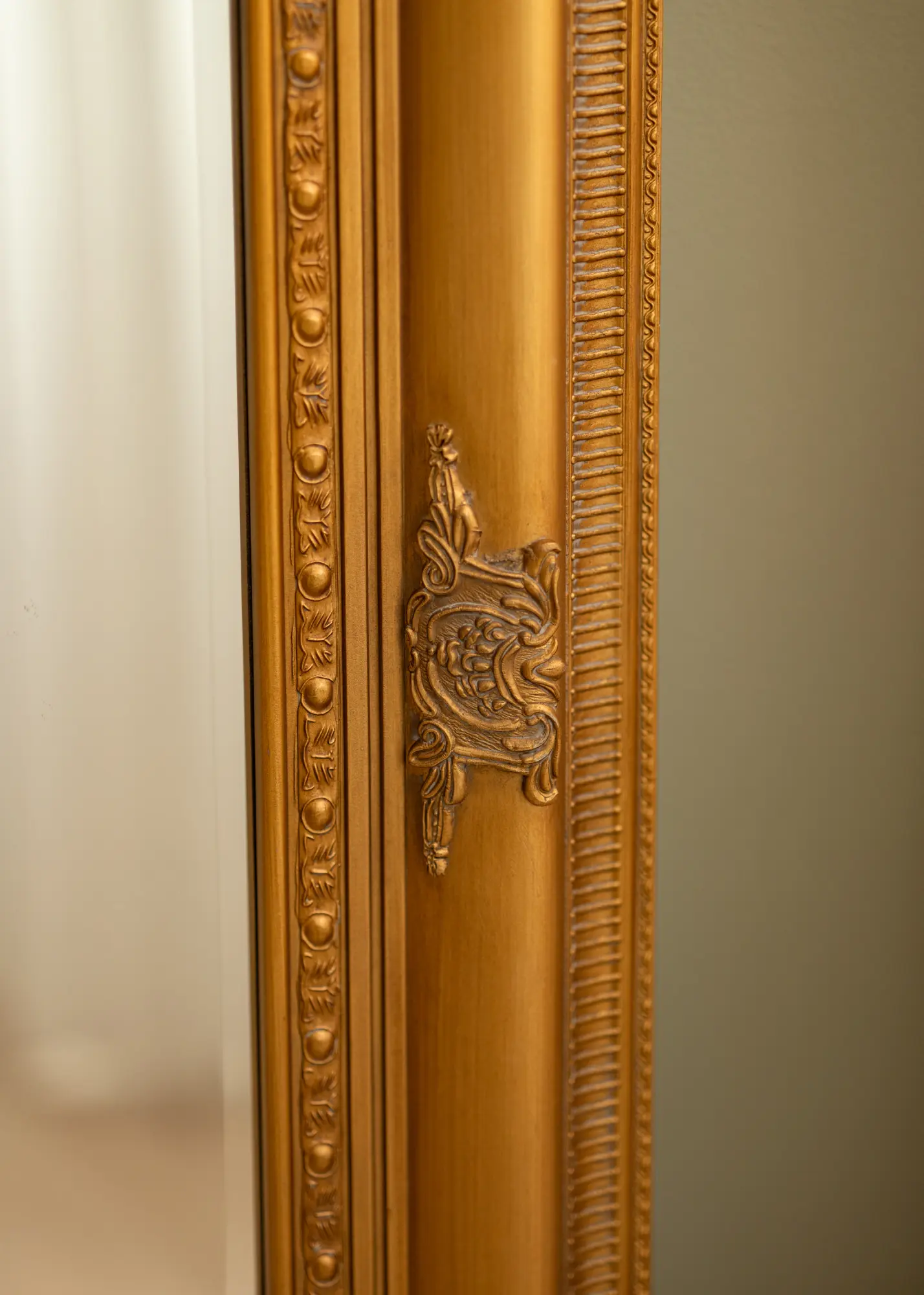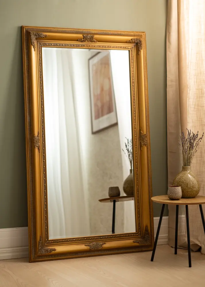 Miroir avec un joli profil de couleur or avec une ambiance antique, décoré d'ornements floraux. Le style classique du cadre du miroir fait qu'il s'intègre bien dans les styles d'intérieurs avec des meubles plus anciens, mais il peut également être utilisé pour créer un contraste captivant dans un intérieur contemporain épuré. Le miroir est superbe à accrocher dans le couloir, la chambre à coucher ainsi que dans un dressing et se met joliment en valeur avec des accessoires d'intérieurs dans des tons laiton ou or.