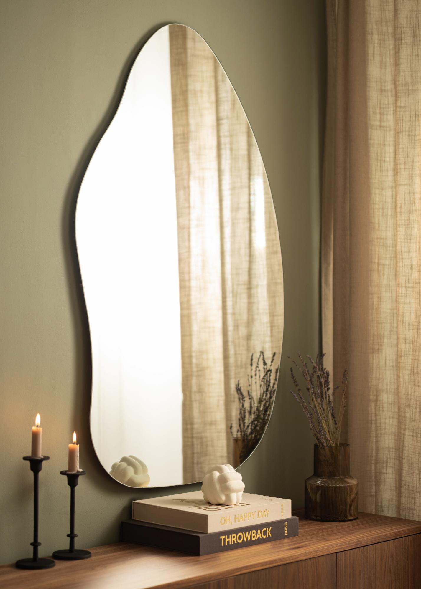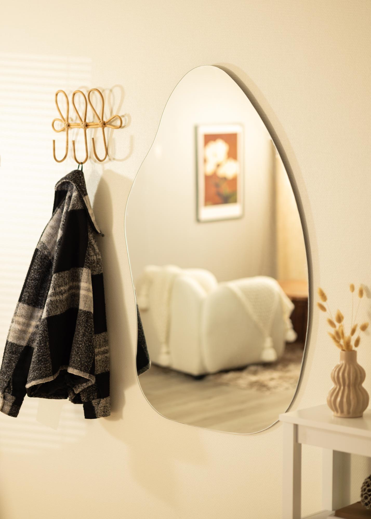 Le miroir a une forme douce et organique rappelant une goutte d'eau ou une feuille dressée, créant une ambiance élégante et moderne dans la pièce. Cette forme unique fait du miroir une conversation à part entière et une oeuvre d'art en soi, tout en remplissant sa fonction pratique.