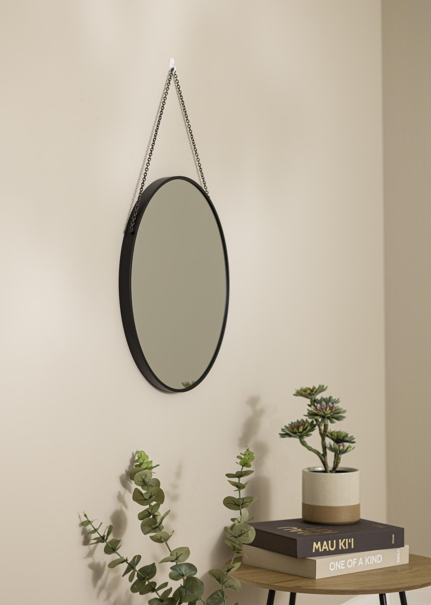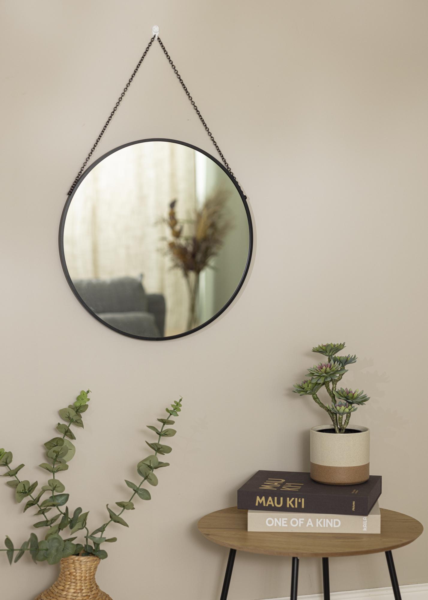 Le miroir rond est un élément d'intérieur classique pour de bonnes raisons ! La forme douce crée une impression d'une grande élégance dans votre maison et rompt avec les lignes droites de votre intérieur. Voici un modèle de miroir rond avec un cadre d'une profondeur de 28 mm et doté d'un joli cadre noir qui peut facilement être assorti aux autres détails décoratifs de votre intérieur. Le cadre du miroir est en métal. Le miroir se suspend au mur grâce à une chaîne noire, ce qui renforce d'avantage son élégance.