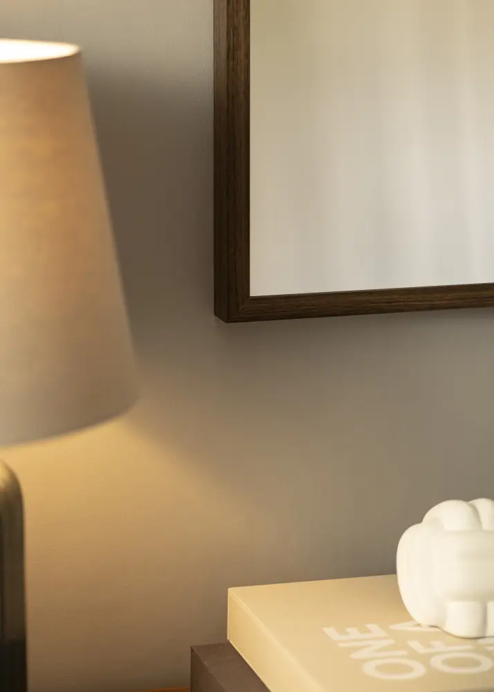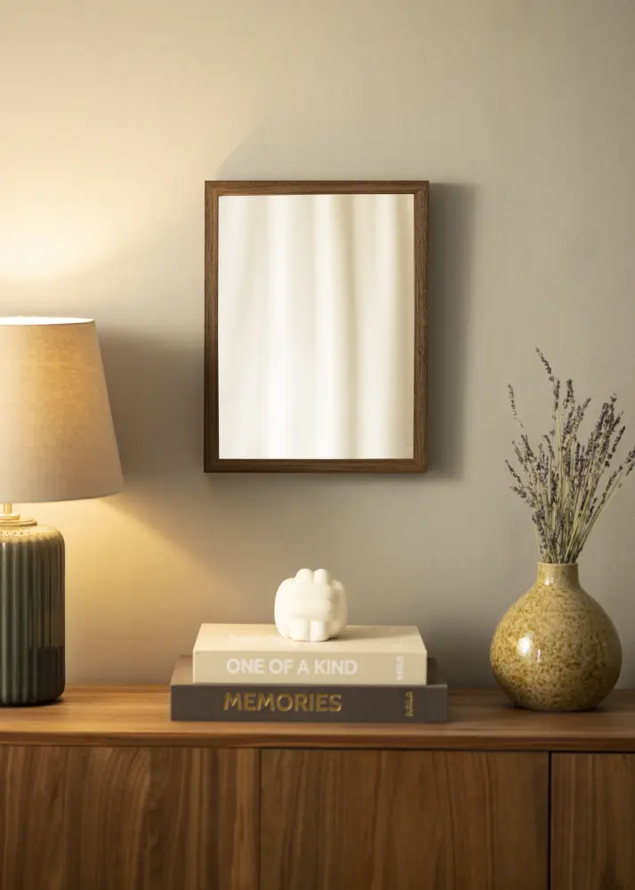 Le cadre du miroir est de 21 mm de large et a une profondeur de 38 mm, ce qui confère une sensation stable et robuste sans compromettre le design élégant. Les bords droits et le profil étroit contribuent à un look moderne et élégant qui convient aux intérieurs classiques et contemporains.