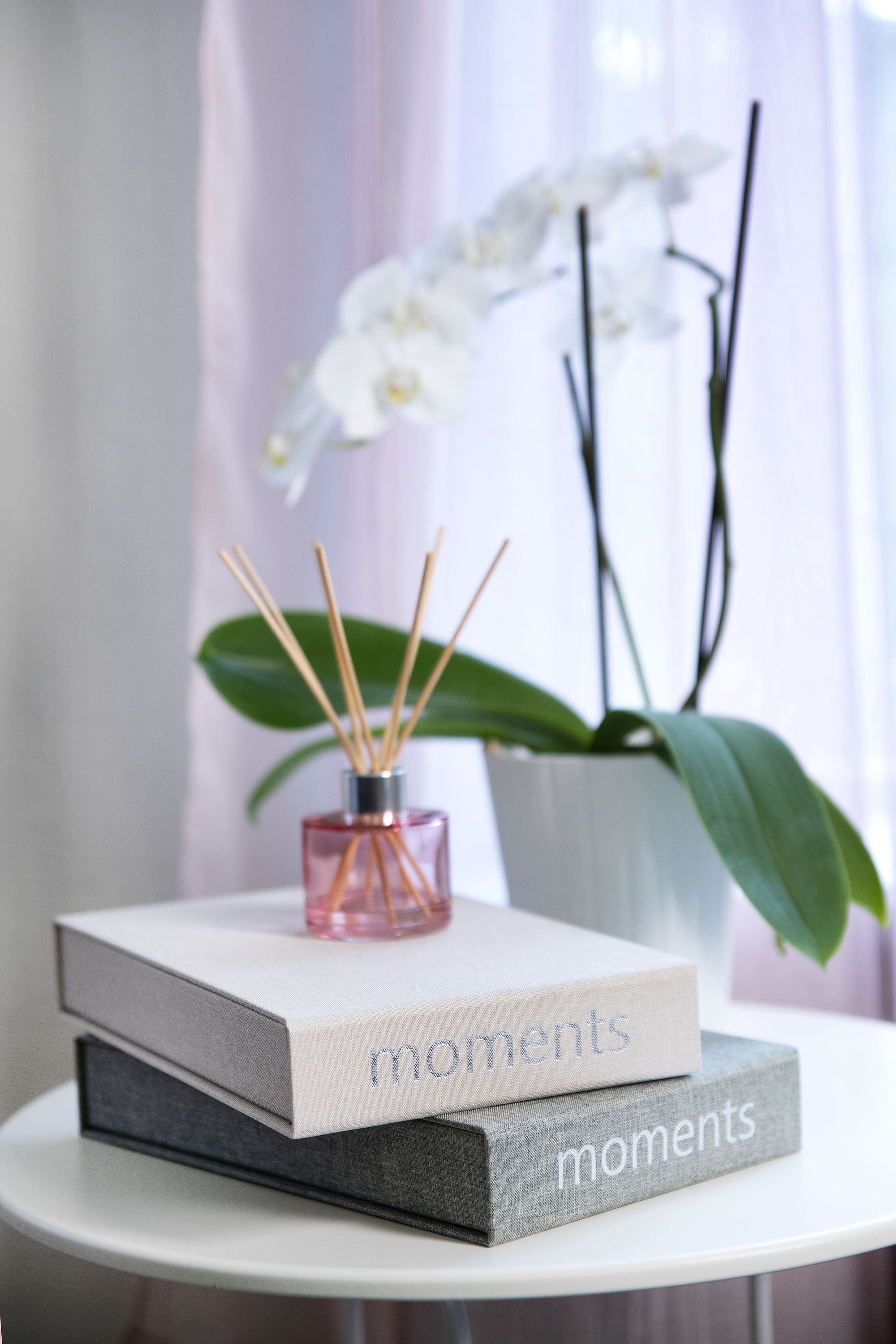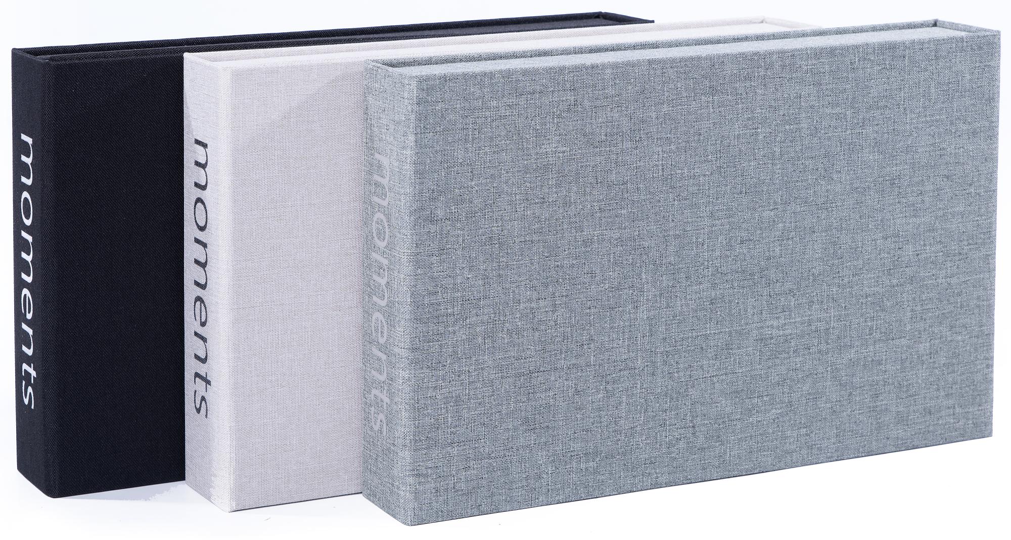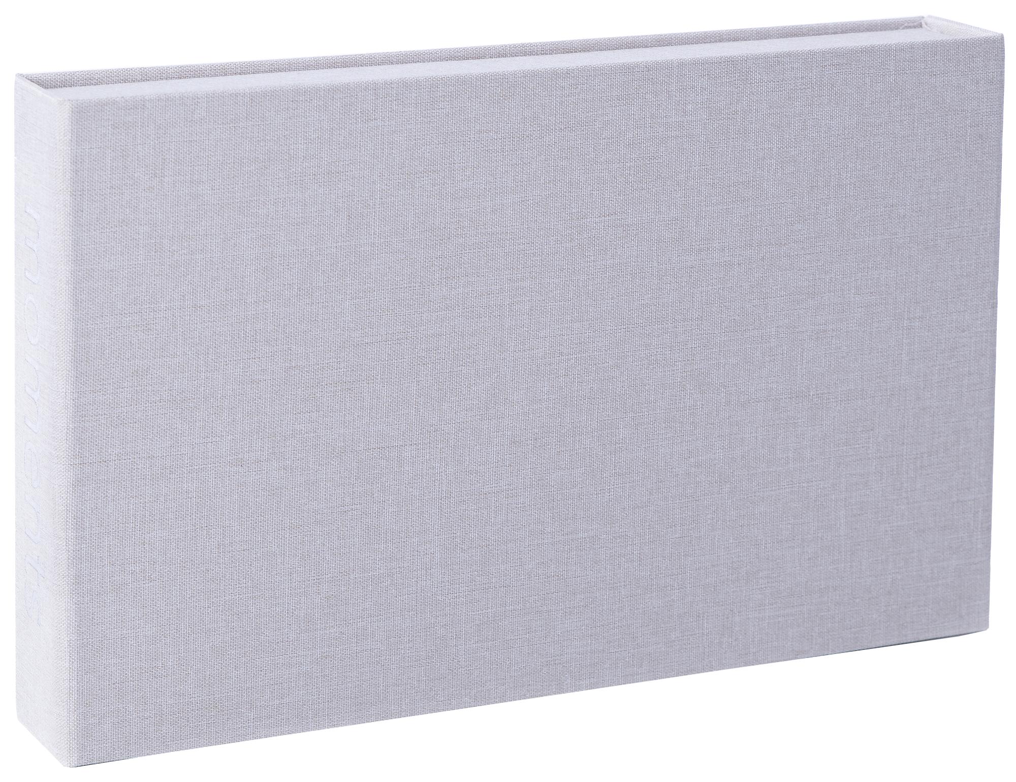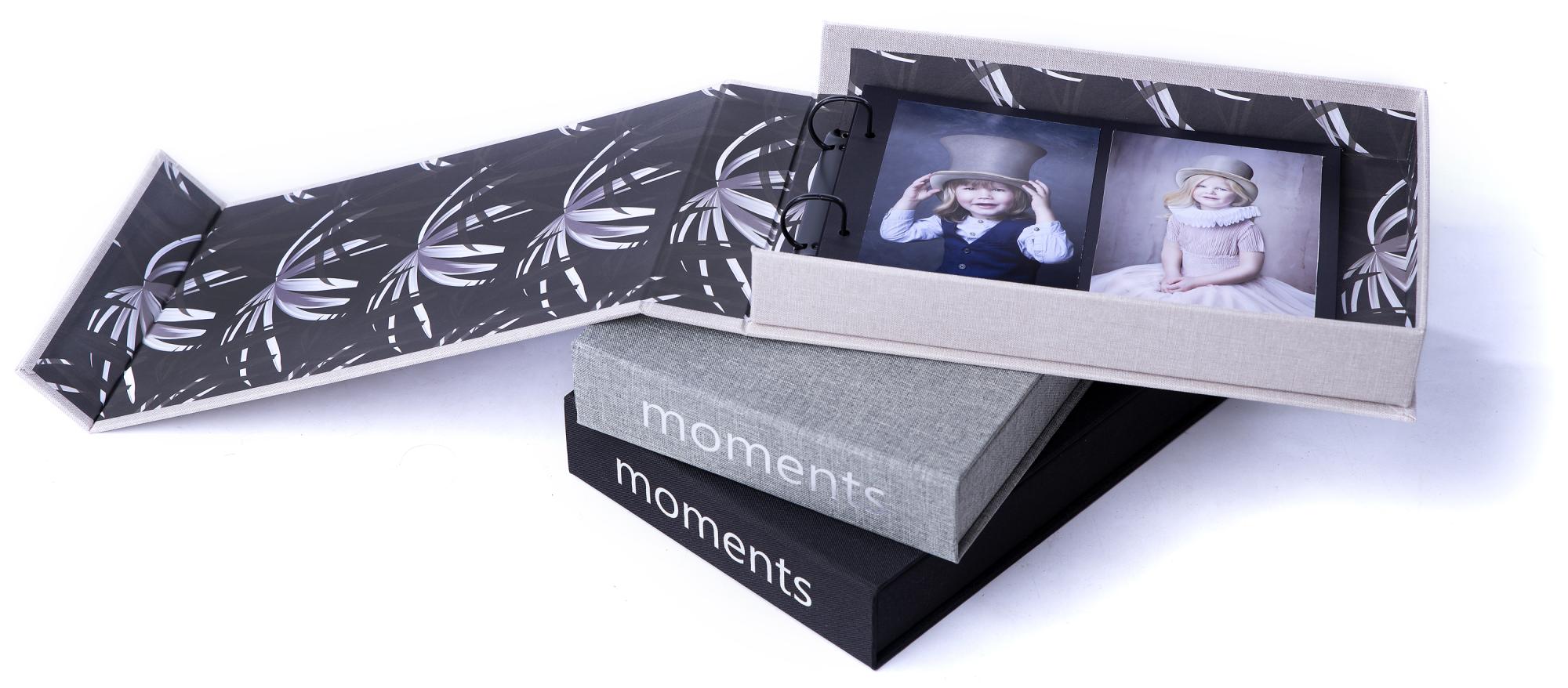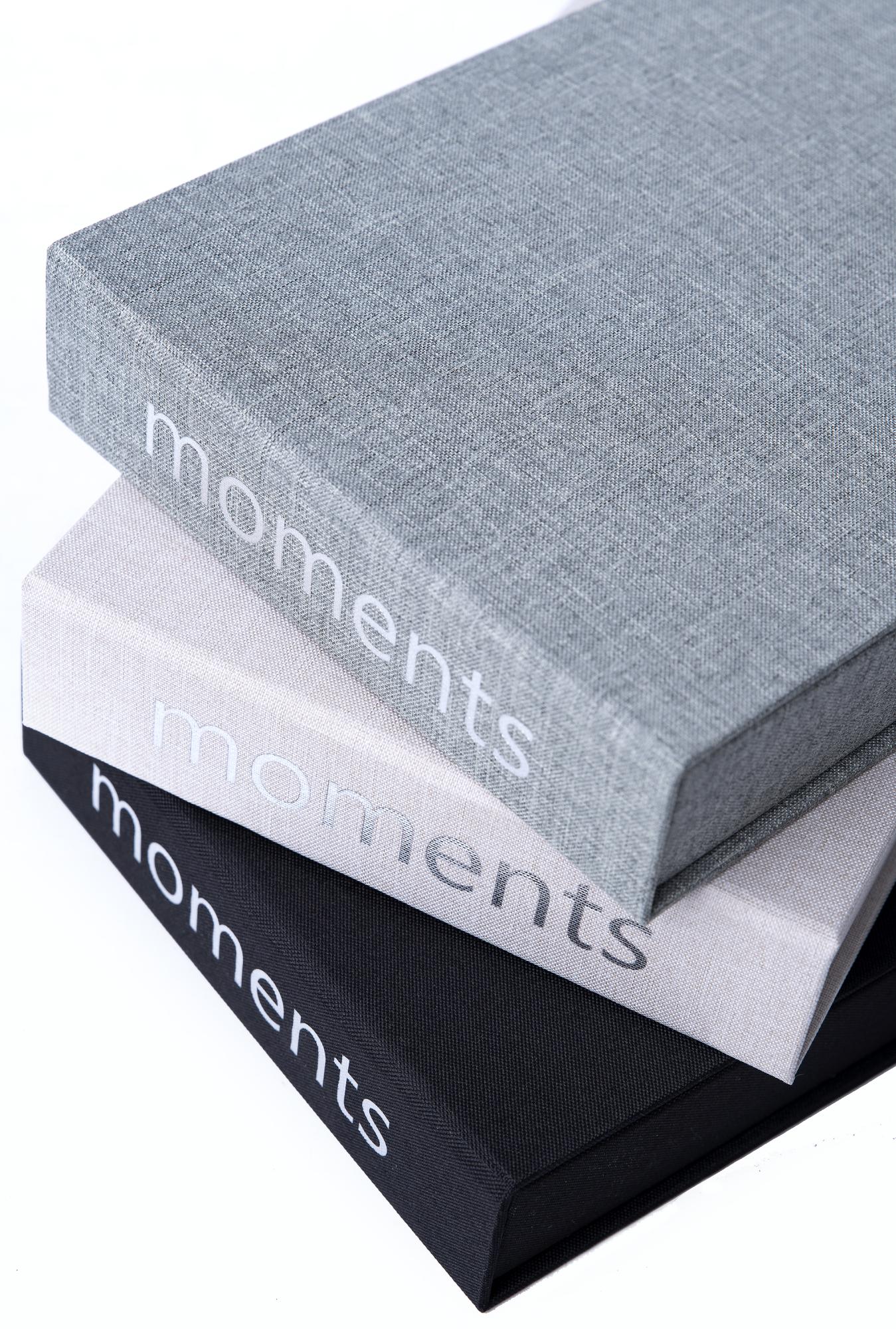 Cet album photo au design élégant est paré d'une couverture habillée de textile beige et du texte "moments" imprimé en argent au dos de l'album. Cet album est conçu comme une boîte, ce qui lui confère une touche de luxe et d'élégance. Cette impression est renforcée lorsque vous ouvrez l'album et êtes accueilli par un beau design de feuilles de palmier.
