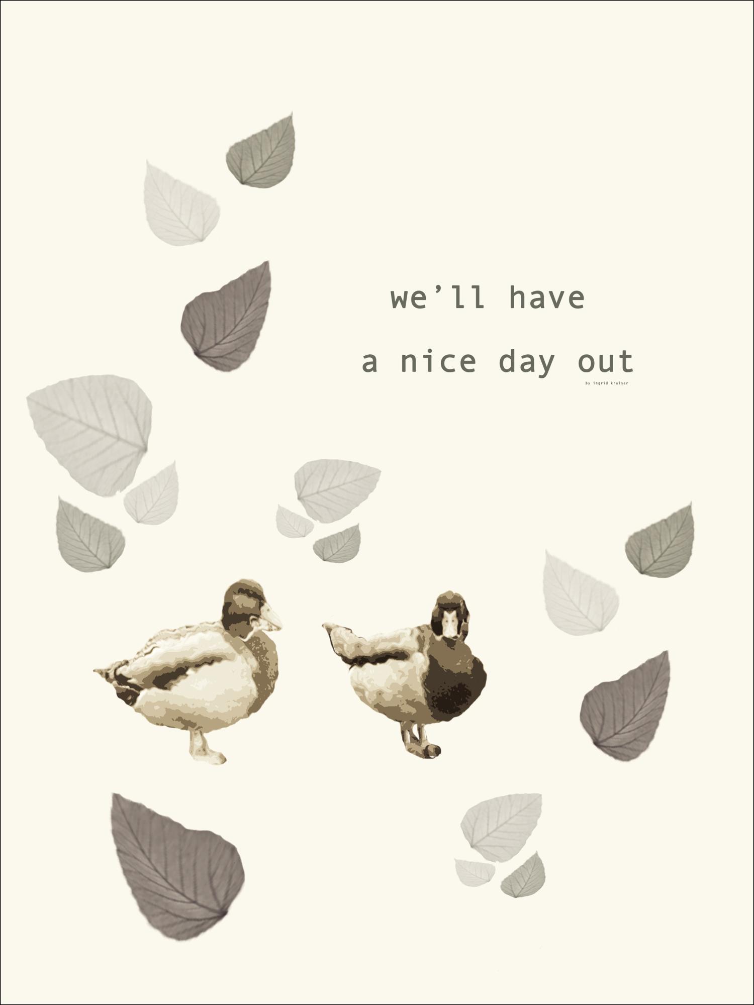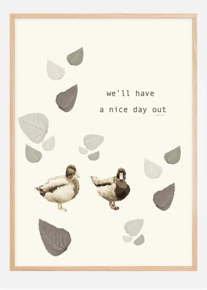 Une affiche en noir et blanc représentant deux oiseaux, des feuilles en grappe et la phrase "nous allons passer une belle journée dehors" parfaitement dessinée sur une surface blanche. Les feuilles et les oiseaux se marient avec leurs doux tons beiges. Le poster parfait pour ceux qui aiment les oiseaux.