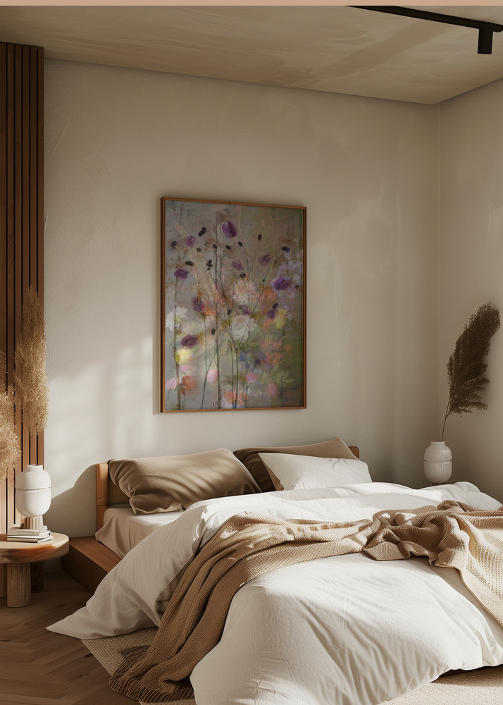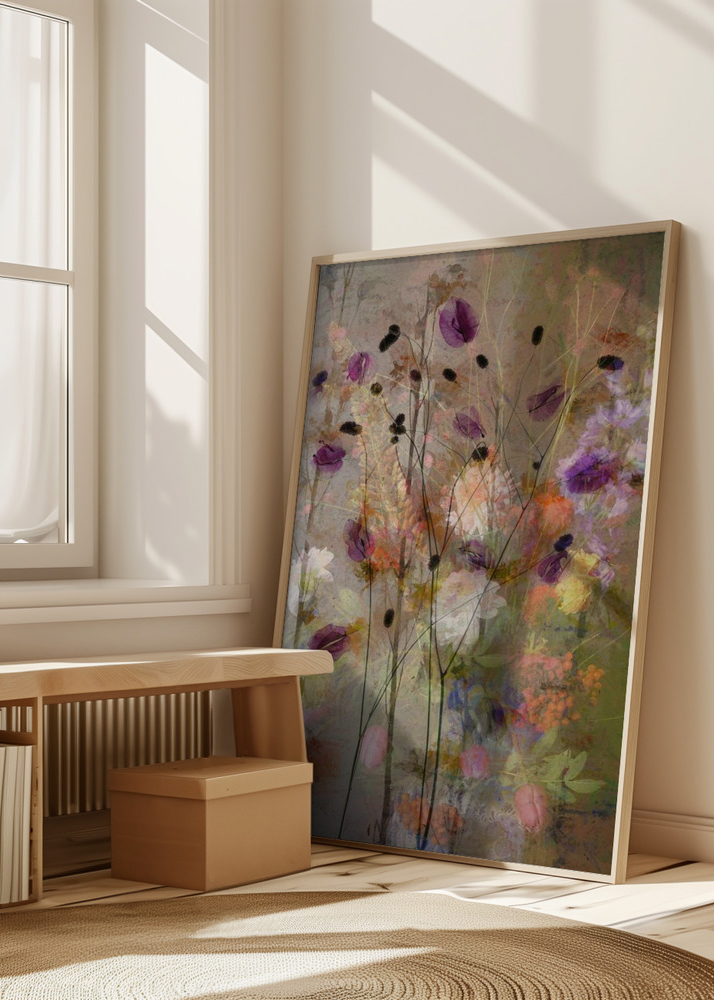 Un étonnant poster peint à la main, de fleurs séchées violettes et blanches. Les couleurs naturelles des fleurs créent une atmosphère relaxante sur fond beige. Les tons verts, violets et orangés sont très doux pour les yeux. Une belle affiche à accrocher à côté de votre table de toilette.