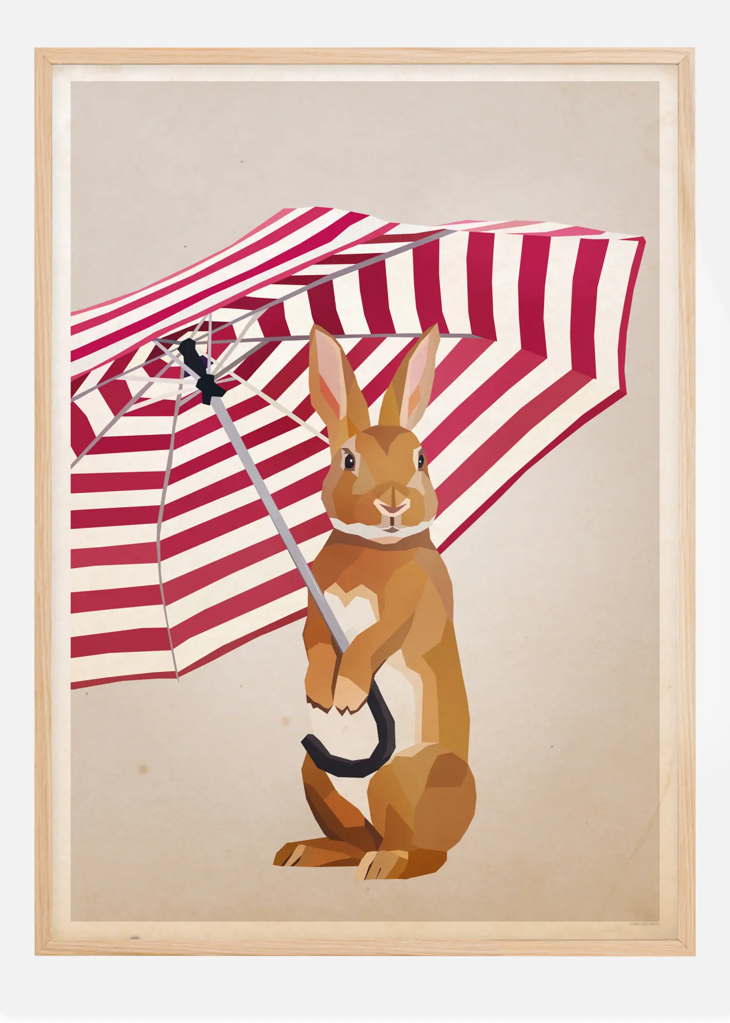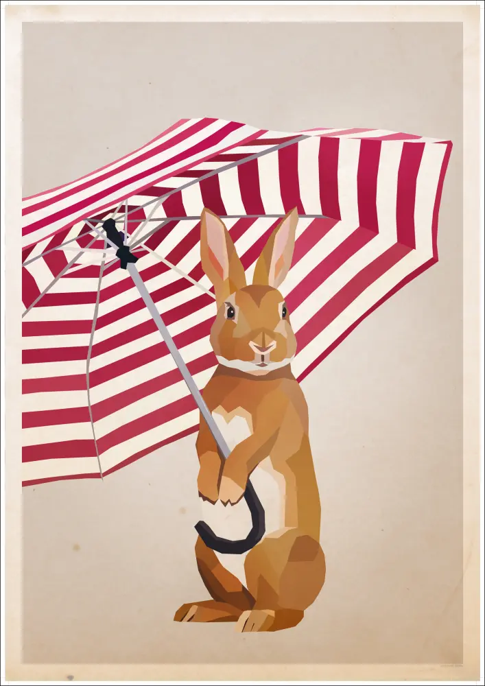 Une œuvre d'art mignonne avec un lapin tenant un parapluie entre ses deux membres supérieurs. Le lapin brun et blanc tient un parapluie rouge et blanc sur un fond beige. Ses yeux regardent droit dans l'appareil photo. Cette affiche est parfaite pour la chambre de votre enfant.