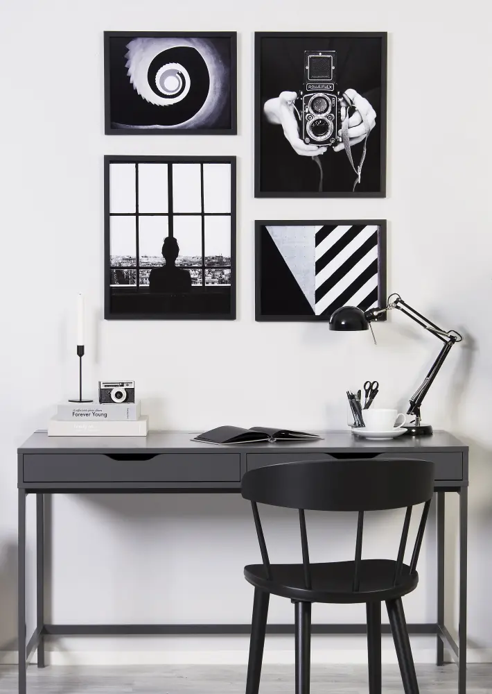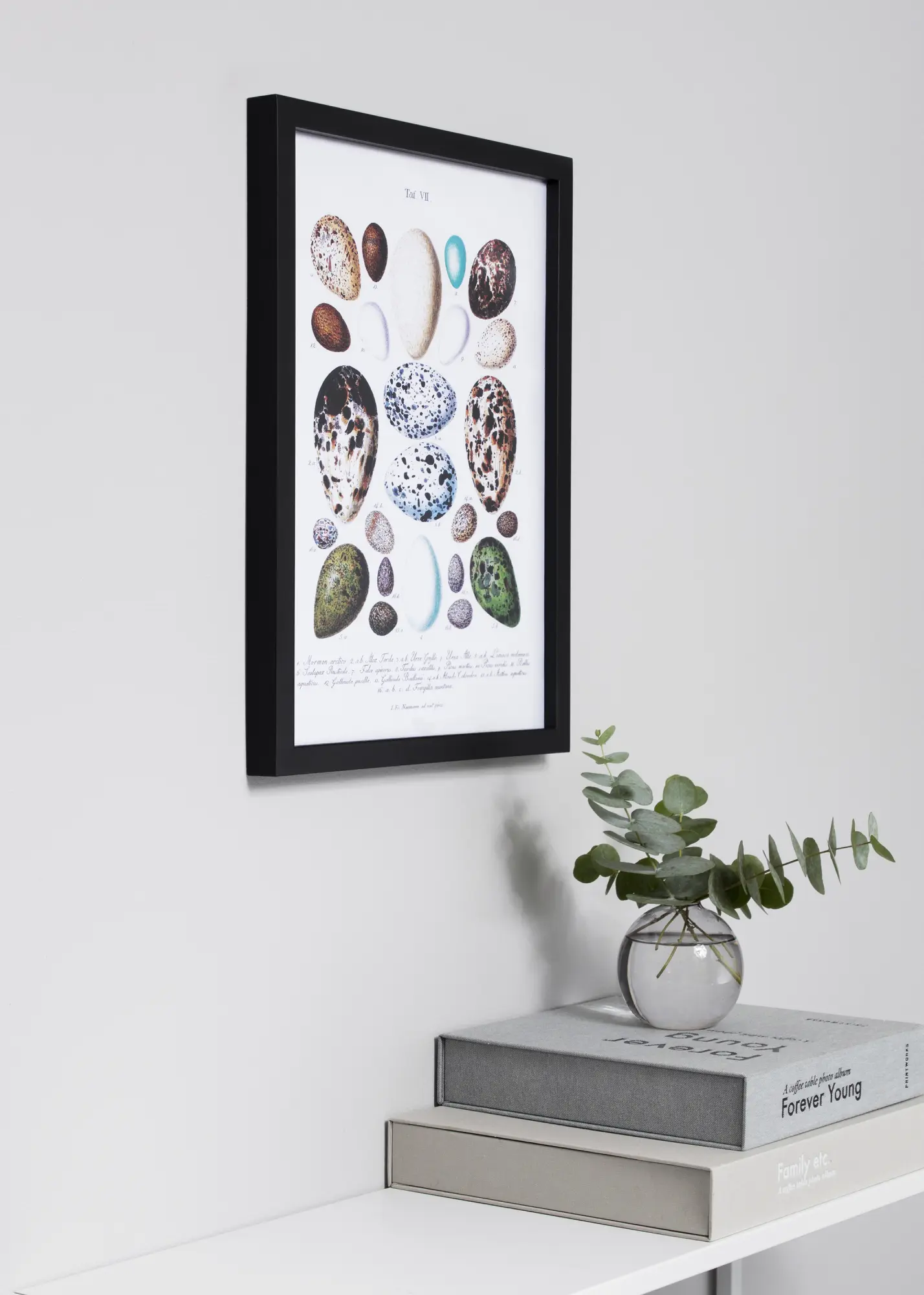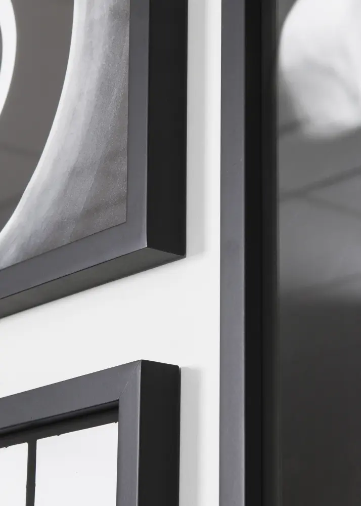 Le cadre peut être accroché au mur en position portrait et paysage, et il s'adapte aussi bien seul au mur qu'en combinaison avec d'autres cadres. Au dos se trouve une plaque de fond en HDF, qui est maintenue en place par de petites broches. Pour insérer vos motifs, dépliez les broches et retirez le fond.