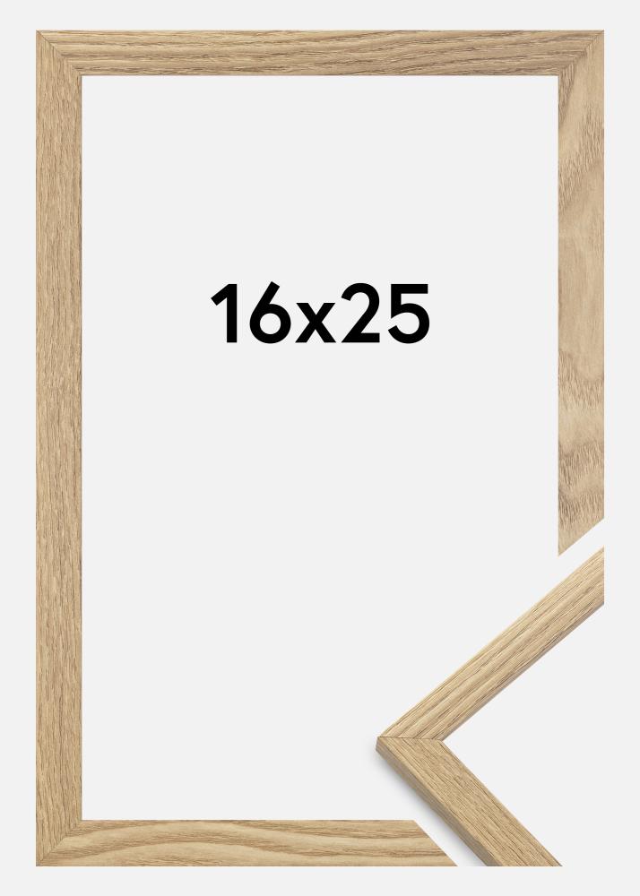Le cadre, fabriqué en MDF avec placage en aluminium et une surface de couleur chêne est doté d'un mince profil de 14 mm. Il y a suffisamment d'espace pour combiner vos images avec un passe-partout luxueux, grâce à la profondeur intérieure du cadre (profondeur de baguette) de 12 mm.