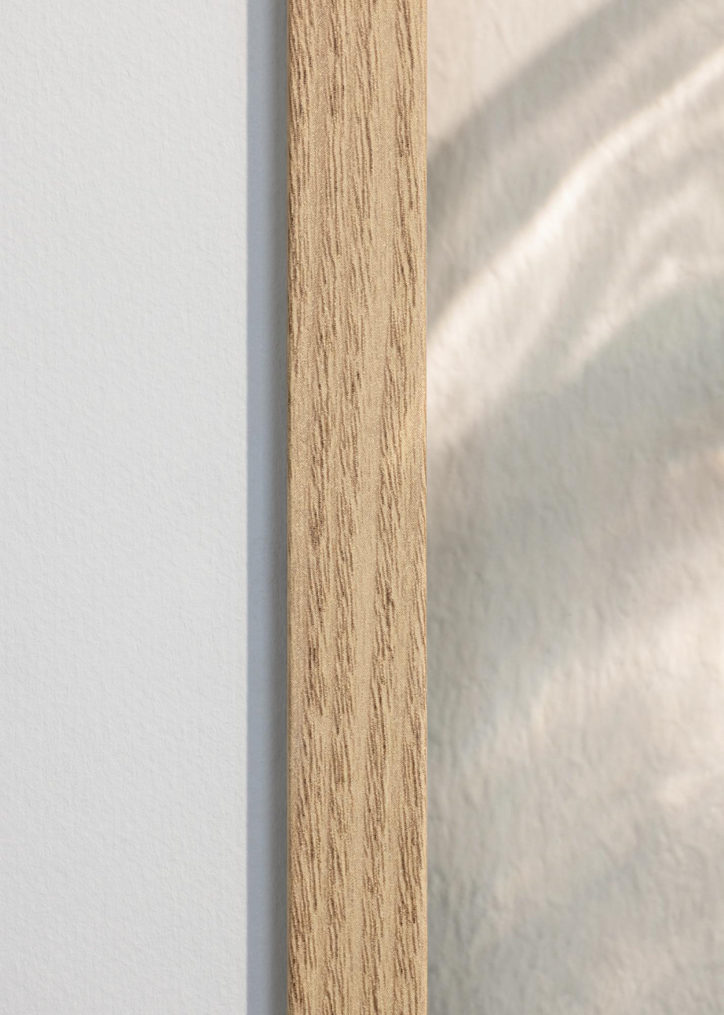 Le cadre, fabriqué en MDF avec placage en aluminium et une surface de couleur chêne est doté d'un mince profil de 14 mm. Il y a suffisamment d'espace pour combiner vos images avec un passe-partout luxueux, grâce à la profondeur intérieure du cadre (profondeur de baguette) de 12 mm.