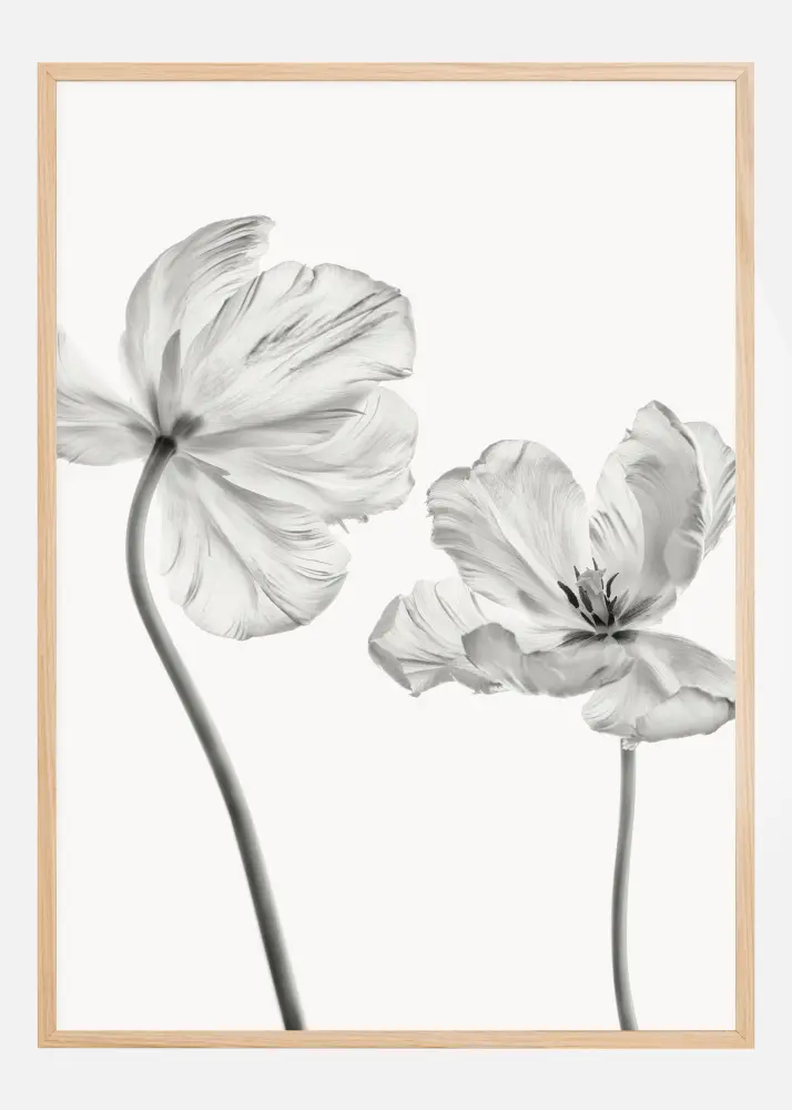 Un simple poster de deux tulipes. Dans un doux noir et blanc, le dessin montre une tulipe ouverte et de face, l'autre est de dos. L'image capture tous les détails élégants des pétales dans cette affiche délicate.
