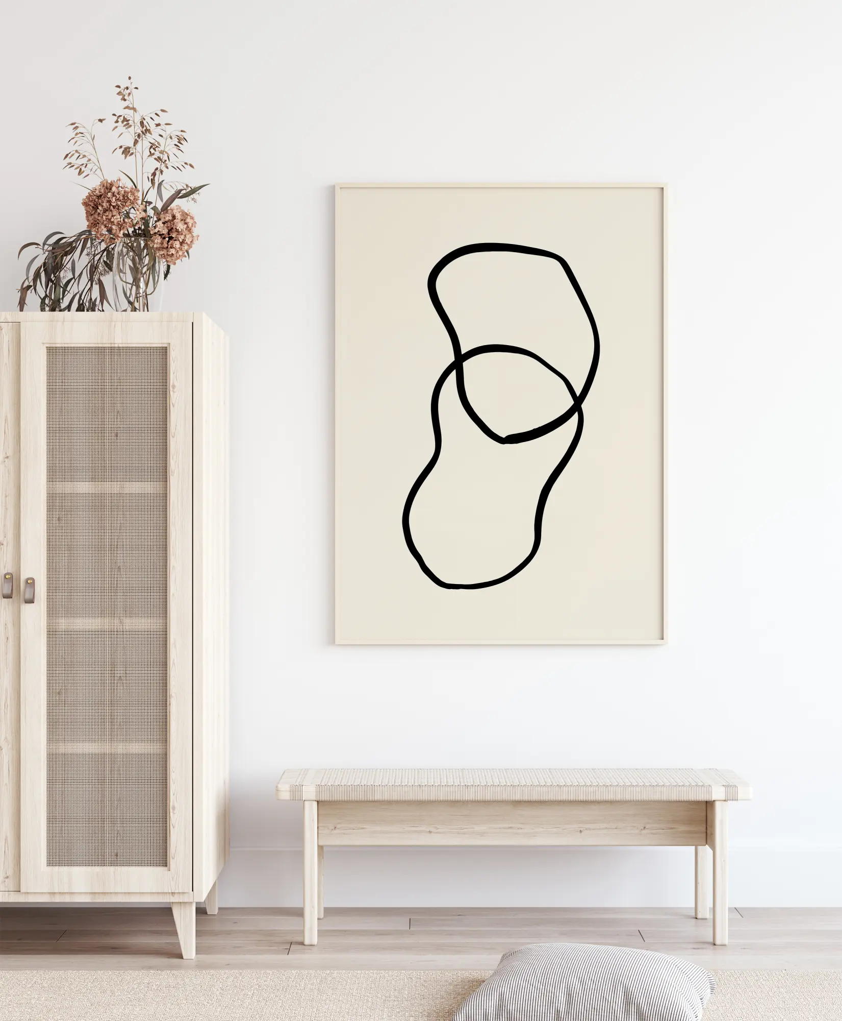 Une affiche abstraite représentant deux formes qui s'entremêlent. Deux formes floues sont dessinées avec des lignes noires audacieuses et se croisent pour créer une troisième forme qui s'entrecroise. Ajoutez cette affiche en noir et blanc à un mur coloré pour créer une ambiance d'art moderne dans votre intérieur.