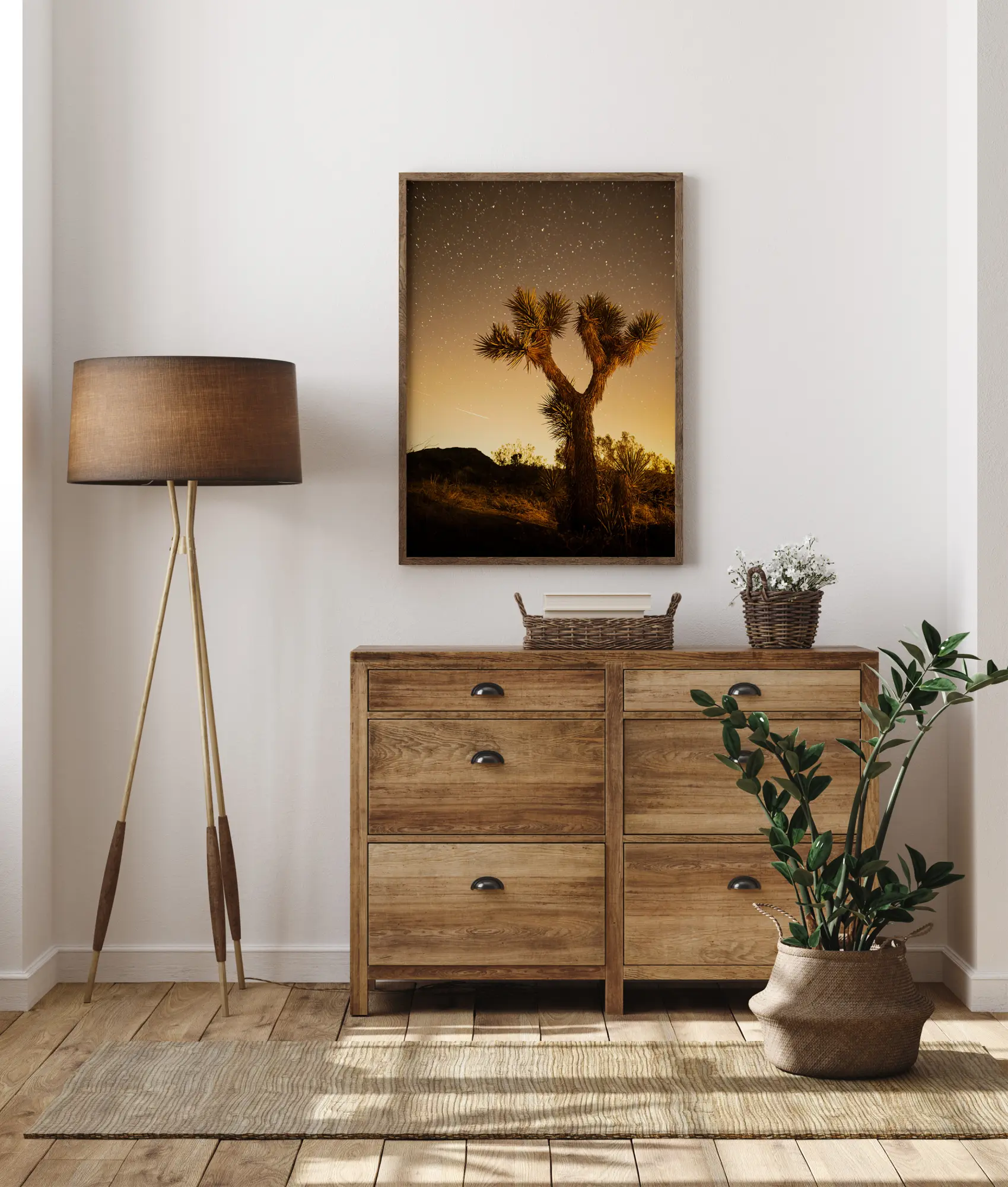 Une affiche nocturne d'un grand cactus dans le désert se dressant contre le ciel nocturne rempli d'étoiles. Le cactus est baigné d'une douce lueur dorée alors que le soleil se couche à l'horizon. Les étoiles clignotent doucement au-dessus de nos têtes dans un ciel doux et chaud. Profitez de la chaleur de ce ciel nocturne désertique.