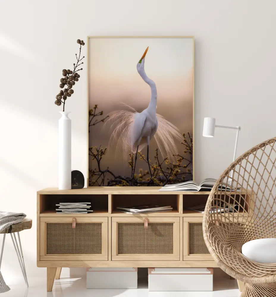 Un poster animalier d'une cigogne dansant dans la lumière du matin. La cigogne est majestueuse et blanche, et le doux lever du soleil à travers ses plumes crée une scène surréaliste. Réveillez-vous chaque matin avec un sentiment d'émerveillement grâce à cette affiche.