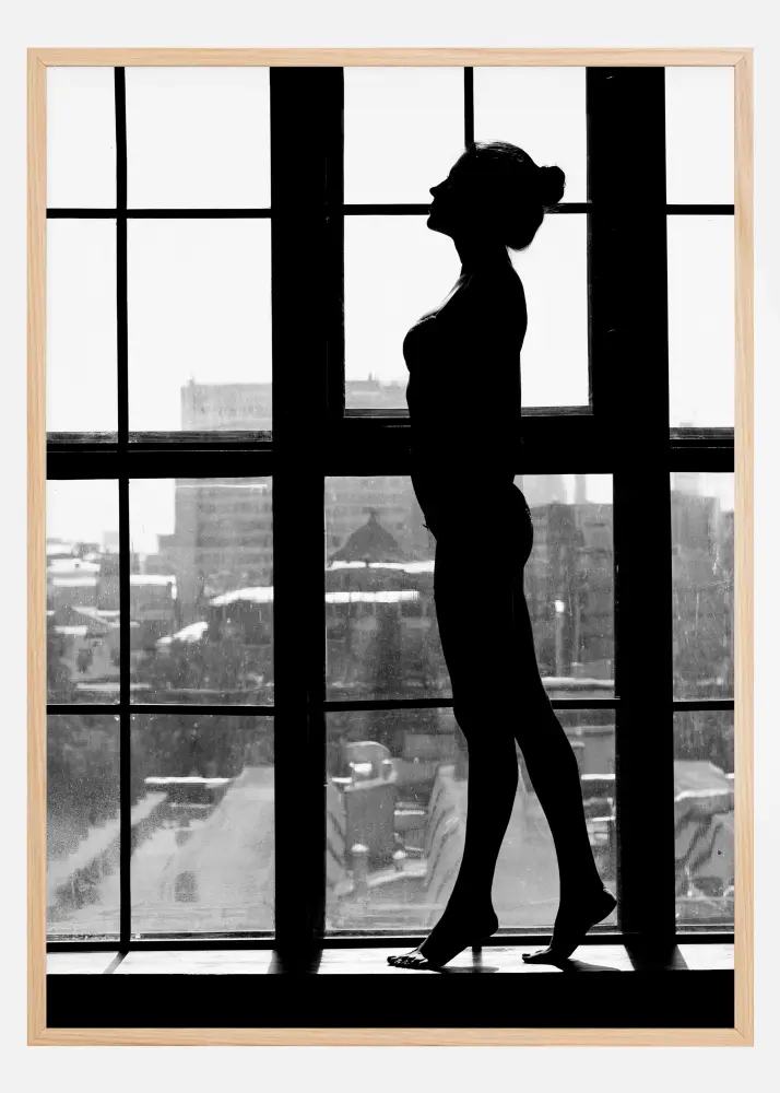 Art photographique en noir et blanc d'une femme debout devant une grande fenêtre industrielle. Le contre-jour transforme la femme en une silhouette sombre contre la ville extérieure. Un poster élégant, parfait pour combiner avec d'autres favoris sur un grand mur de tableaux.