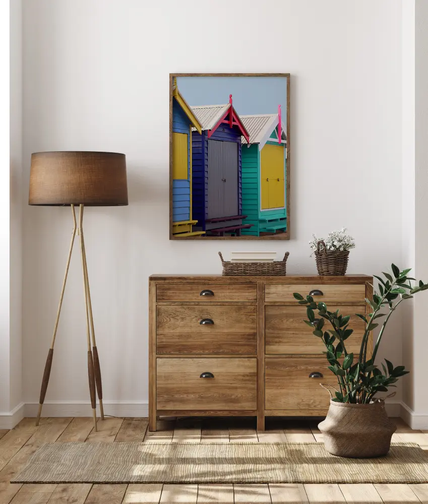 Une affiche lumineuse de cabines de plage colorées. Chacune des cabanes est peinte dans des couleurs vibrantes différentes : jaune, bleu, rose et turquoise. Donnez l'illusion d'être à la plage en été en ajoutant ce poster à un mur banal. Apportez de la couleur à votre maison.