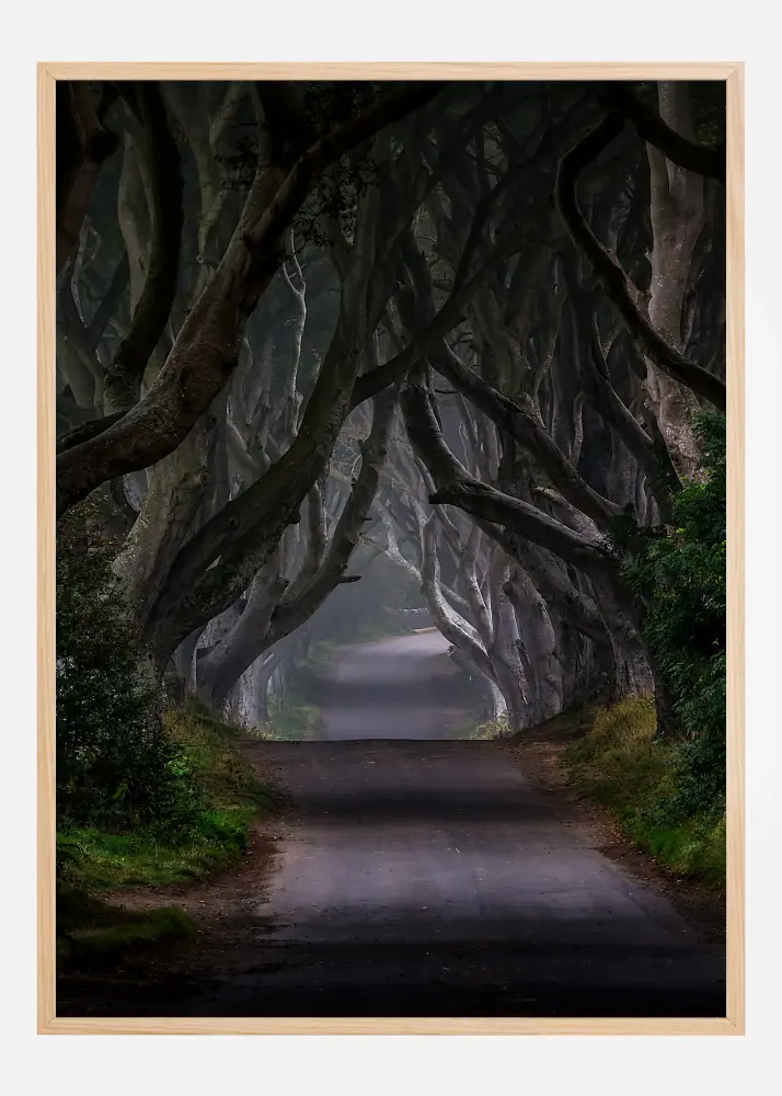 Une affiche mystérieuse d'une route qui serpente entre des arbres courbés qui se plient ensemble au-dessus de la route. Une atmosphère plutôt inquiétante règne sur cette image, car les branches sombres se tordent au-dessus.. Des taches d'herbe d'un vert éclatant bordent la route qui s'éloigne. Serez-vous assez courageux pour emprunter ce chemin ?