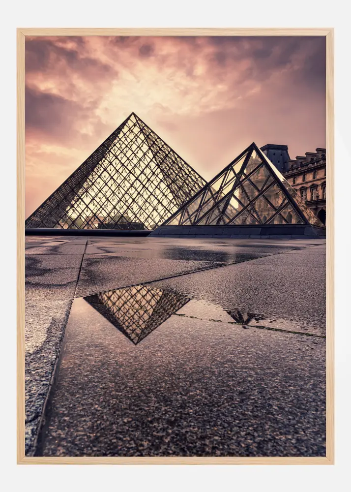 Cette affiche moderne représente les formes géométriques emblématiques d'une célèbre structure, reflétée dans une flaque d'eau. Les triangles métalliques étincelants et les panneaux de verre sont capturés dans une perspective audacieuse, avec un ciel peint dans des teintes douces de violet et de rose, comme les dernières lumières du crépuscule. La palette de couleurs s'étend des tons froids de gris et d'argent aux tons chauds de cuivre, reflétant à la fois la durabilité de la construction et la beauté éphémère du ciel.