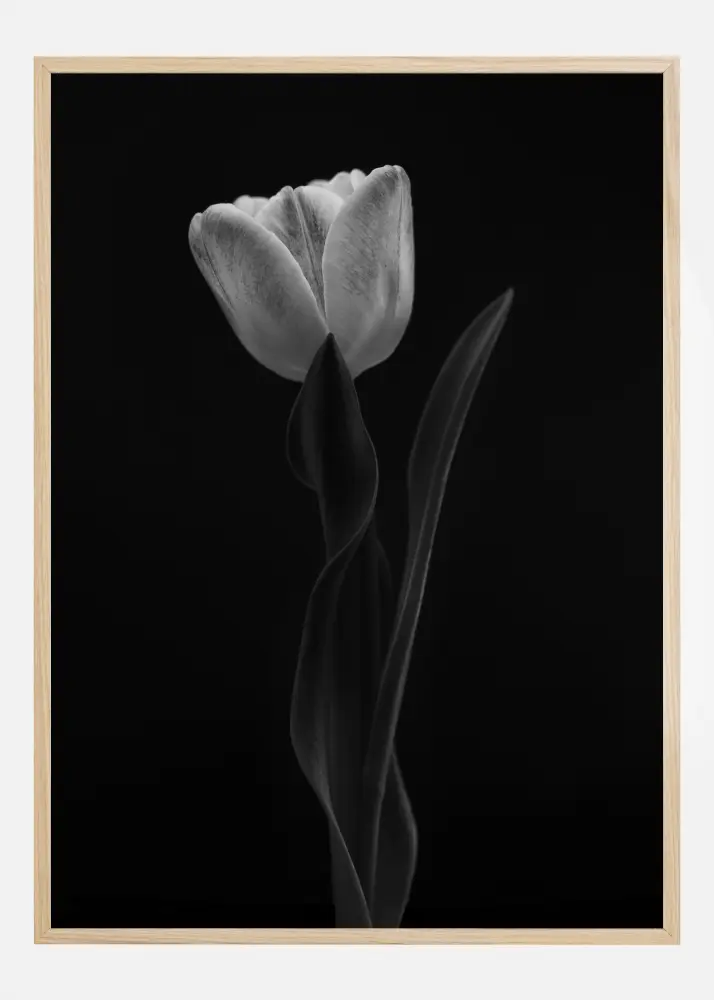 Une simple affiche de nature représentant une tulipe blanche sur un fond noir. Apportez une touche d'élégance à votre maison en accrochant cette affiche sur un simple mur de couleur pour faire ressortir la fleur.