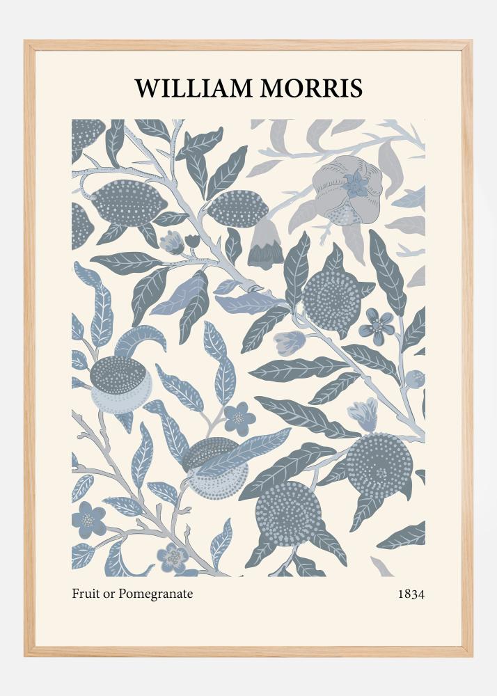 Cette affiche détaillée et élégante met en avant le design iconique de William Morris "Fruit or Pomegranate", ici présenté avec une palette de couleurs rafraîchissante et élégante. L'agencement sophistiqué de grenades mélangées à diverses formes de feuilles et de fleurs donne une impression de nature vivante et florissante. La palette de couleurs discrète de l'affiche, avec des nuances de bleu et de gris sur un fond crème, donne une impression sophistiquée et contemporaine qui s'intègre parfaitement dans une variété de styles d'intérieur.