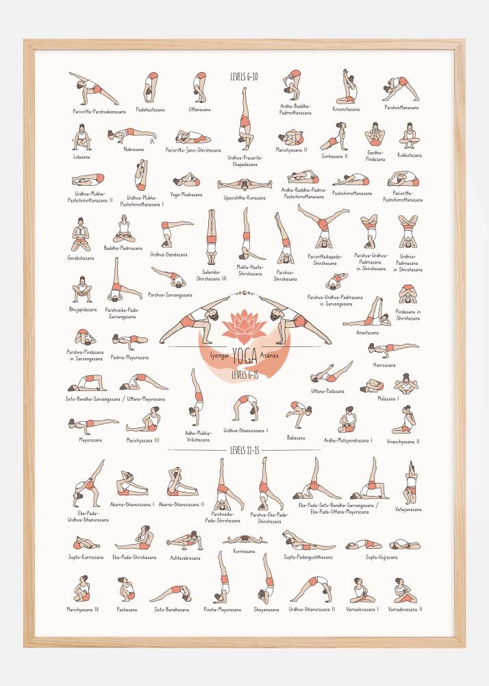 Ce poster de yoga détaillé et coloré illustre une collection complète d'asanas de yoga Iyengar du niveau 6 au niveau 15. Chaque posture de yoga est finement illustrée avec des couleurs chaudes et agréables qui mettent en valeur chaque forme et geste, tandis que les noms clairement identifiables à côté de chaque illustration facilitent le suivi et la pratique. Le design est à la fois fonctionnel et esthétique, créant une atmosphère accueillante pour les pratiquants de yoga de tous niveaux de compétence.